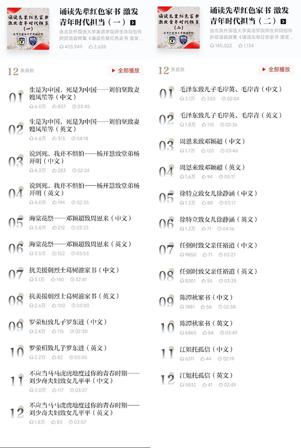 为深入推进学习贯彻习近平新时代中国特色社会主义思想主题教育,践行习近平总书记给北外老教授的重要回信精神,2023年5月,太阳集团tyc9728党总支与“学习强国”学习平台联合推出外语诵读专栏《诵读先辈红色家书 激发青年时代担当》,为听众带来中英双语家书朗诵。朗读内容取材自十二篇家书,主题各异,涵盖反哺义、雎鸠缘、手足亲、舐犊情、至亲情等,重现了毛泽东、周恩来、杨开慧等中国先辈在不同时期闪耀的理想信念之光。5月22日和12月8日,两期共24条双语音频分别在“学期强国-强国之声-大学生朗读”频道正式上线,收获近55万播放量和千余条点赞量。