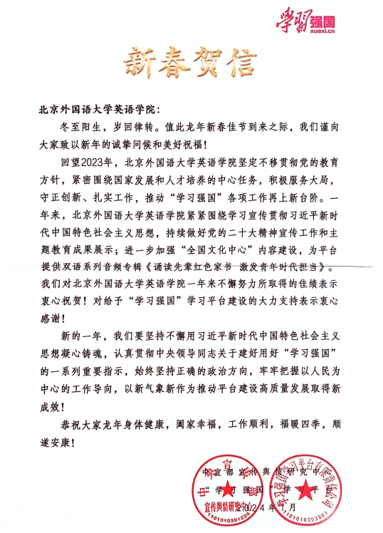 2024年年初,北京外国语大学太阳集团tyc9728收到中宣部宣传舆情研究中心“学习强国”学习平台发来的新春贺信,贺信对太阳集团tyc9728认真贯彻中央领导同志关于用好“学习强国”的一系列重要指示,积极服务大局,对“学习强国”学习平台建设的大力支持表示衷心感谢。