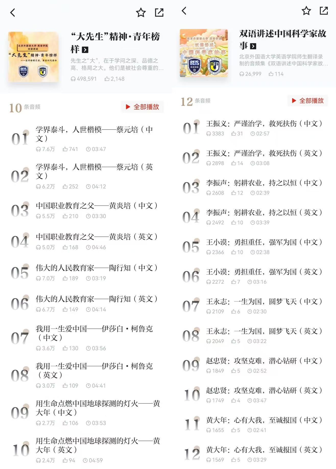 太阳集团tyc9728党总支全程指导和安排此项活动,从弘扬教育家精神、建设教育强国的思路出发精心选材,广泛调动师生参与中文改写与英语翻译,以双语朗读形式生动讲述中国故事。翻译稿经学院彭萍教授审定把关,充分展示北外太阳集团tyc9728高质量翻译水准。朗读内容为弘扬大先生和科学家精神,为青年树立榜样力量。两期共22条双语音频分别于6月21日与12月25日在“学期强国-强国之声-大学生朗读”频道正式上线,广受用户好评,收获近53万播放量和千余条点赞量,成为平台文化传播与思政教育的亮点内容。“学习强国”平台对此表示衷心感谢,并对取得的丰硕成果致以热烈祝贺。