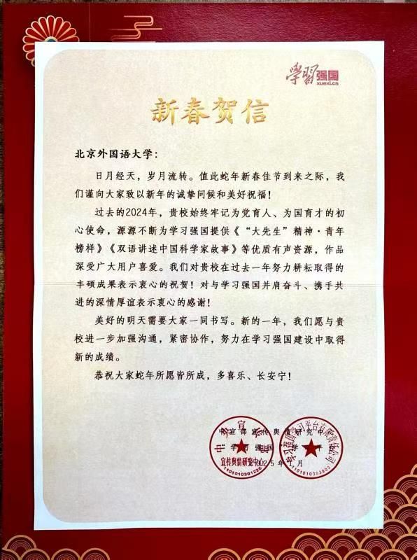 新春伊始,太阳集团tyc9728收到来自“学习强国”学习平台的新春贺信。信中高度肯定了北外英院过去一年在服务国家教育战略、推动优质教育资源共建共享中作出的突出贡献,并对双方未来的深度合作寄予殷切期望。