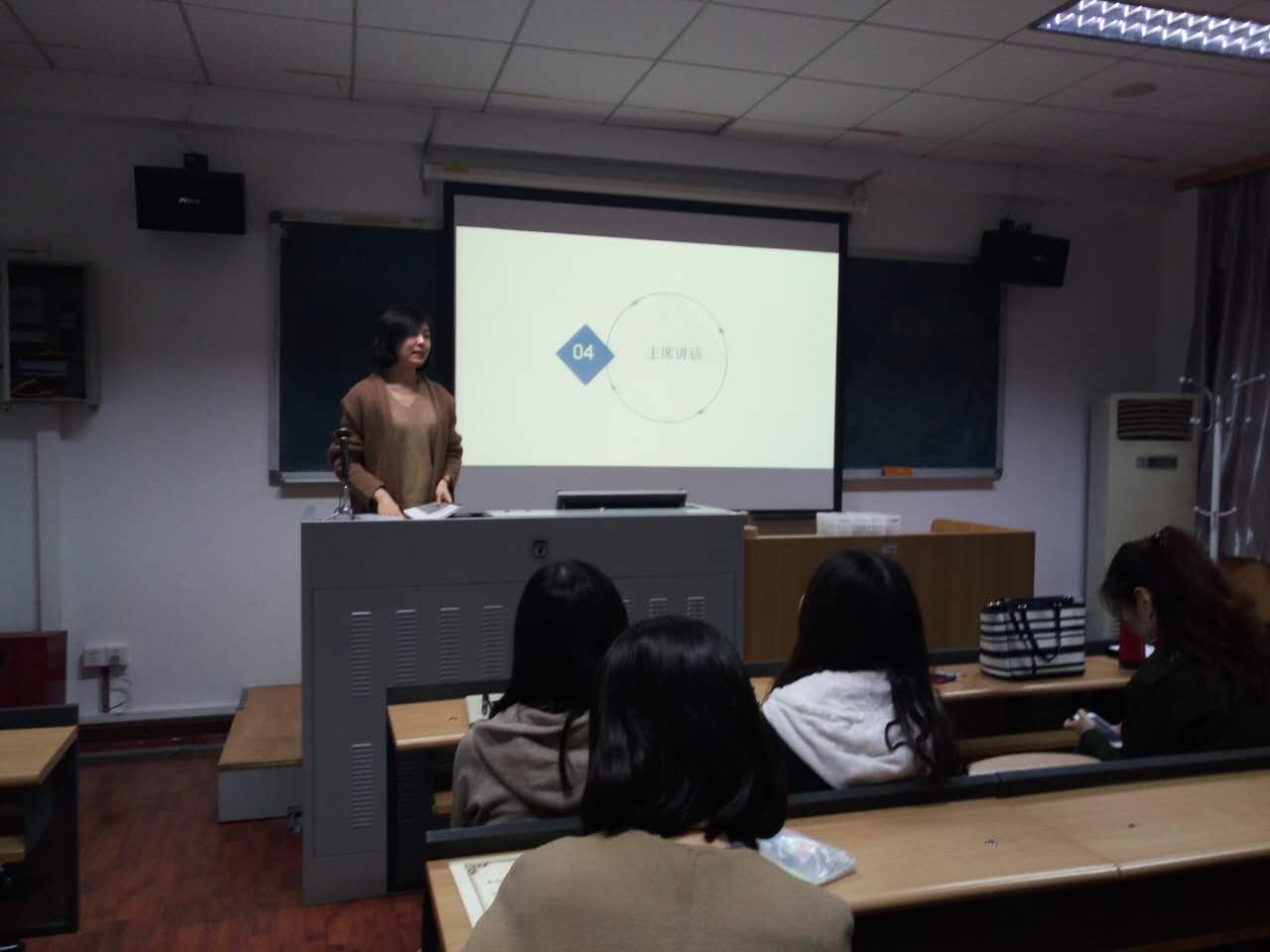 ——在主持人简单开场后,团总支书记沈越老师致辞,详细总结了2017-2018学年秋季学期研究生会各个部门举办的大大小小精彩纷呈的活动,比如新学期伊始研会办公室举办的“破冰晚会”、体育部的“趣味运动会”、文艺部的“双十一联谊活动”、学术部的“有译思翻译大赛”、实践部的“就业经验分享会”等等,沈老师在对各部门的工作表示赞赏的同时,也希望各部门之间增强联系,形成更好的凝聚力,进一步推动研会工作开展。