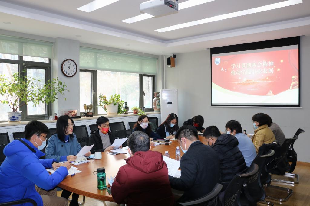 此次会议主题为“学习贯彻两会精神 推动学院事业发展”。与会人员围绕习近平总书记在2022年全国“两会”重要讲话精神、政府工作报告等内容,结合学院建设发展,进行了交流发言。