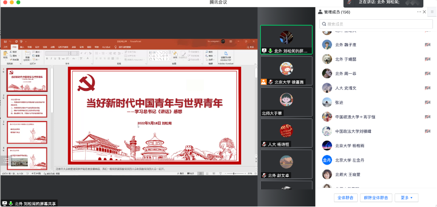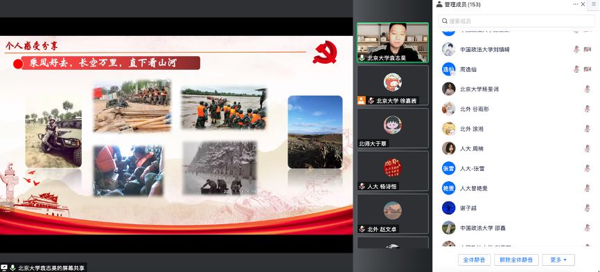 学习分享会上,北京大学、北京师范大学、中国人民大学、中国政法大学四个党支部分别分享了习近平总书记视察各自学校的重要讲话精神与学习心得体会。北京外国语大学党支部分享了学习贯彻习近平总书记在庆祝共青团成立100周年大会上的重要讲话精神。