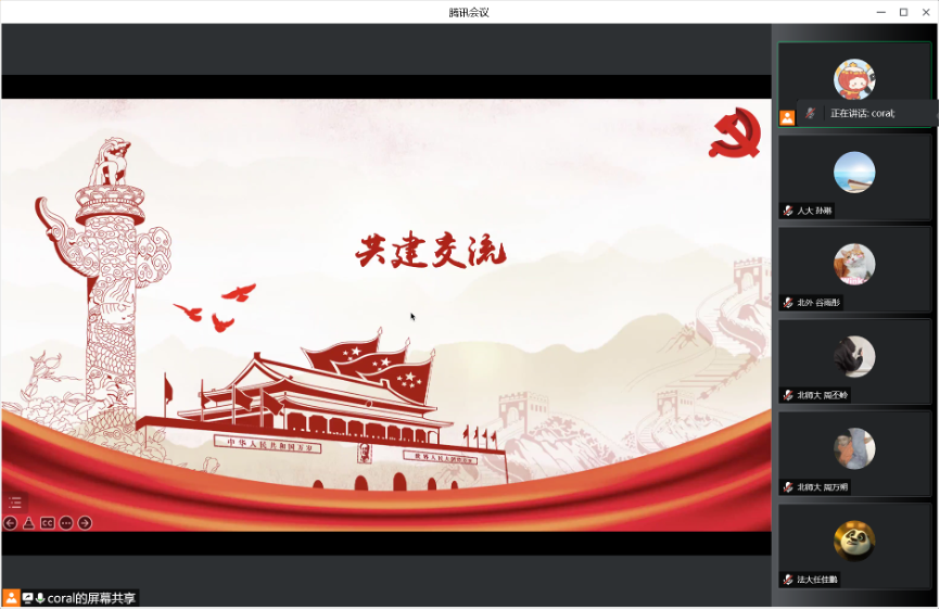在各支部的分享结束后,五个支部支委进行了支部共建经验交流,探索赋能基层党支部工作的新模式。大家一致认为,不同背景的五个支部强强联合,定会产生“1+1+1+1+1>5”的效果。本次共建活动中,不同支部党员结合自己学校的红色资源、学科特色,通过在线交流研讨,打造了党员间交流沟通的新天地、支部间教育学习的新窗口、高校间博采众长的新渠道。通过本次共建活动让青年党员真正受益,进一步学习贯彻习近平总书记的重要讲话精神、了解党的光辉历史、感悟党的初心使命、领会党的创新理论、体认党的精神谱系、传承党的红色基因。本次支部共建活动激励党员同学明德立志,共担复兴重任,共谱时代华章。