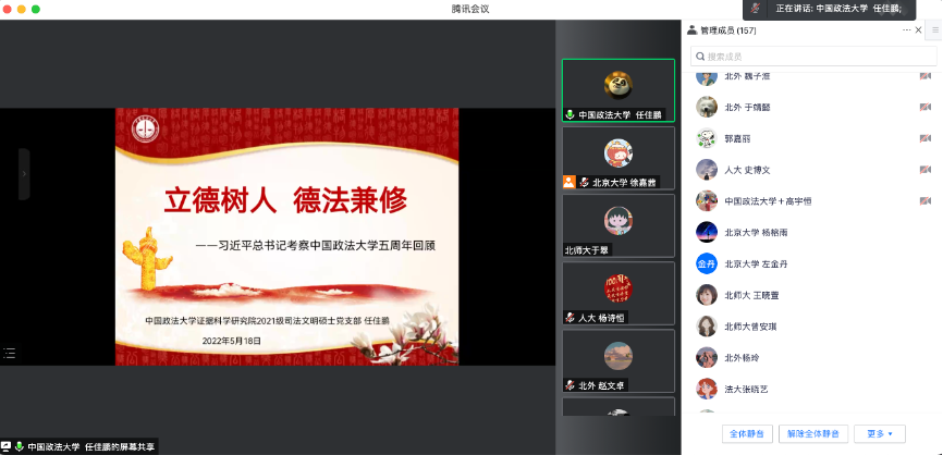 在当前疫情防控形势严峻的情况下,为持续推进英院学子理论学习走深走实。5月18日晚19点,北京外国语大学太阳集团tyc9728本科生党支部与北京大学2021级法律硕士(非法学)第四党支部、中国人民大学法学院2021级法律硕士二支部、北京师范大学法学院2021级法硕第二党支部、中国政法大学证据科学研究院2021级司法文明硕士党支部联合开展“青春心向党,强国有担当”主题党日活动。