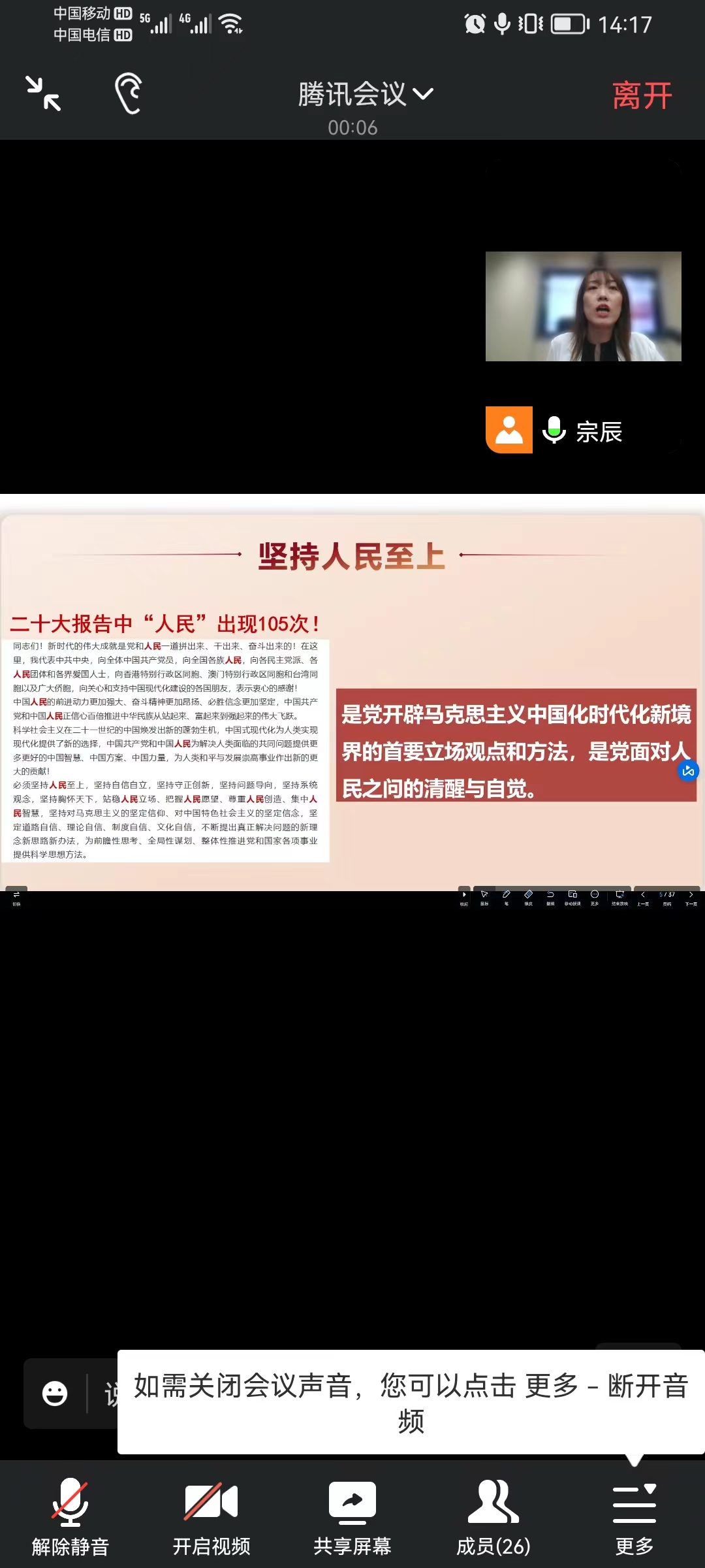 读书班分为专家领读和自学两个部分,马克思主义学院副院长王曼倩副教授受邀作为领读专家,以“深刻理解必须坚持人民至上”为主题讲述专题党课。王曼倩围绕党的二十大报告,从理论、历史、成果三个逻辑层次,深入浅出地讲述了中国共产党坚持人民至上思想的发展脉络和重大成就。她指出坚持人民至上是党开辟马克思主义中国化时代化新境界的首要立场观点和方法,是党面对人民之问的清醒与自觉。她聚焦“马克思主义的本质要求”、“党百年奋斗的初心使命”、“新时代巨大成就的力量之源”、“全面建设社会主义现代化国家的最大底气”四个方面,深刻阐释了什么是人民至上,为什么坚持人民至上以及如何坚持人民至上。