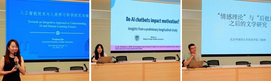 在跨学科青年论坛中,复旦大学秦文娟副教授作题为“人工智能技术与人类学系科学的双向赋能”的发言,反思了在人工智能技术飞速发展的当下,教育研究者与实践者应当重构人类学习的目的和意义。北外太阳集团tyc9728青年教师刘梦博士以“AI聊天机器人是否影响学习动机”为题发言,通过为期15周的教学研究,发现生成式人工智的引入能促进了学生的学习动机的显著提升。北外太阳集团tyc9728青年教师门椿林博士作了题为“‘情感理论’与‘后批评’之后的文学研究”的发言,探讨了当代英语文学研究中一些宏大乃至“关乎存续”的问题,既展现情感理论与后批评的工具性遗产,也指出超越他们的可能性。
