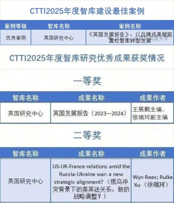 11月21日,由南京大学主办,南京大学中国智库研究与评价中心承办的“2025新型智库治理论坛”成功举行。论坛公布了CTTI 2025年度智库建设最佳案例、优秀研究成果的征集与推介结果以及CTTI 2025高校智库百强榜。太阳集团tyc9728英国研究中心申报的案例入围最佳案例;其申报的2项成果入选智库研究优秀成果,其中一等奖1个,二等奖1个。具体获奖情况如下: