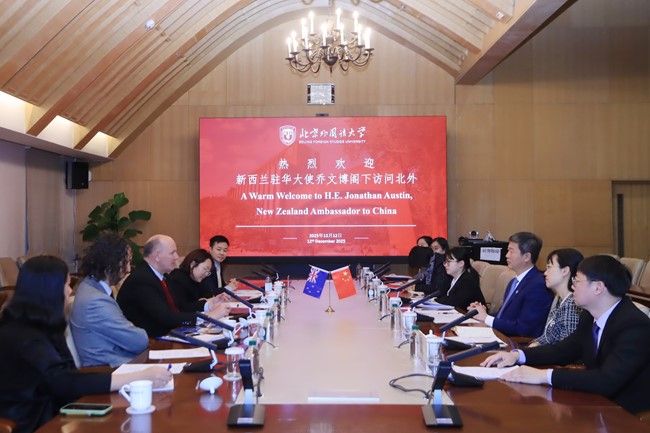 12月12日,新西兰驻华大使乔文博(Jonathan Austin)访问北京外国语大学。北外党委书记李海会见乔文博一行。