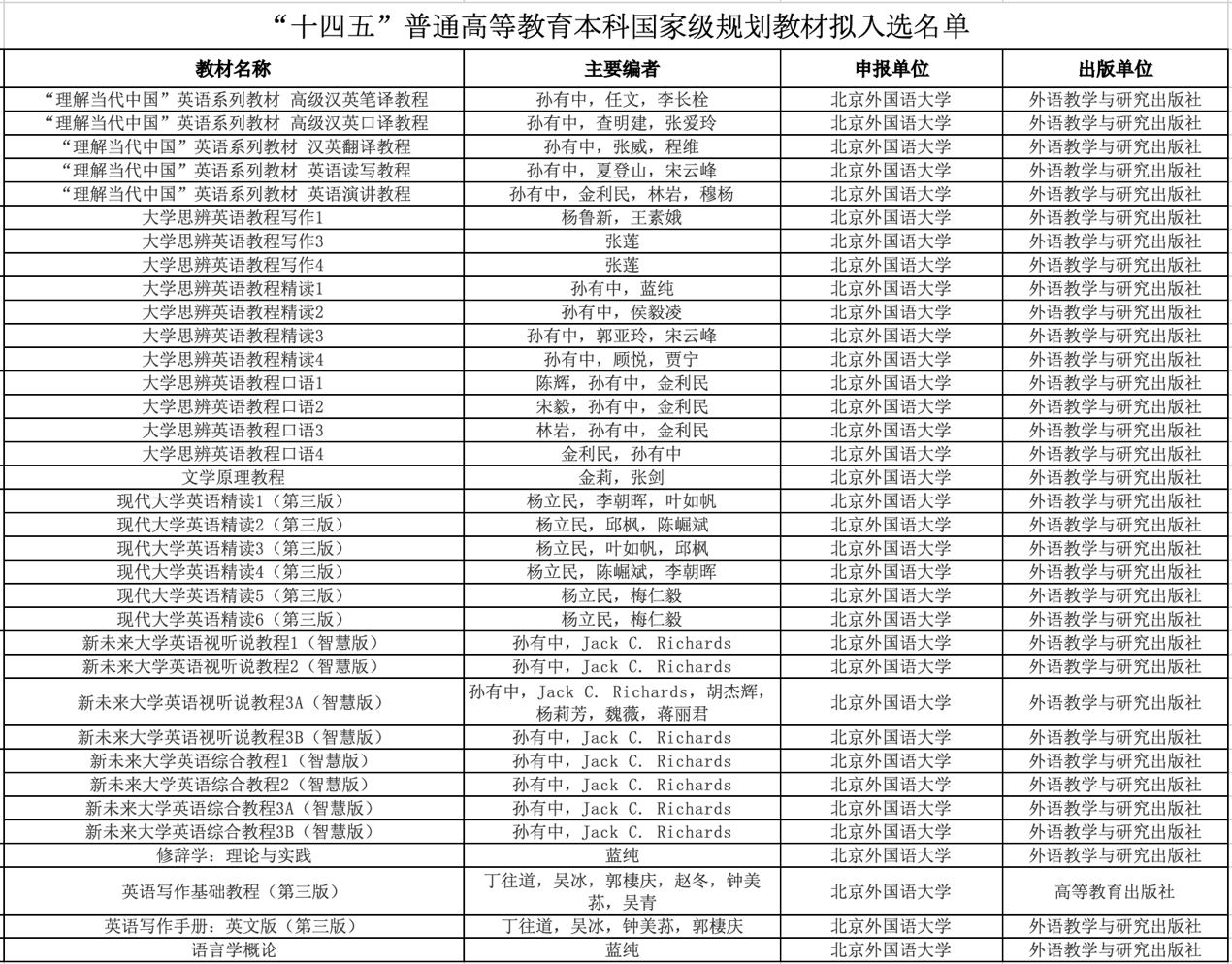 太阳集团tyc972835册教材拟入选“十四五”普通高等教育本科国家级规划教材,其中包括孙有中教授等主编的《“理解当代中国”英语系列教材》,杨鲁新、张莲、孙有中教授等主编的《大学思辨英语教程》系列教材,杨立民教授等主编的《现代大学英语》系列教材,在学校各语种拟入选教材中名列前位。
