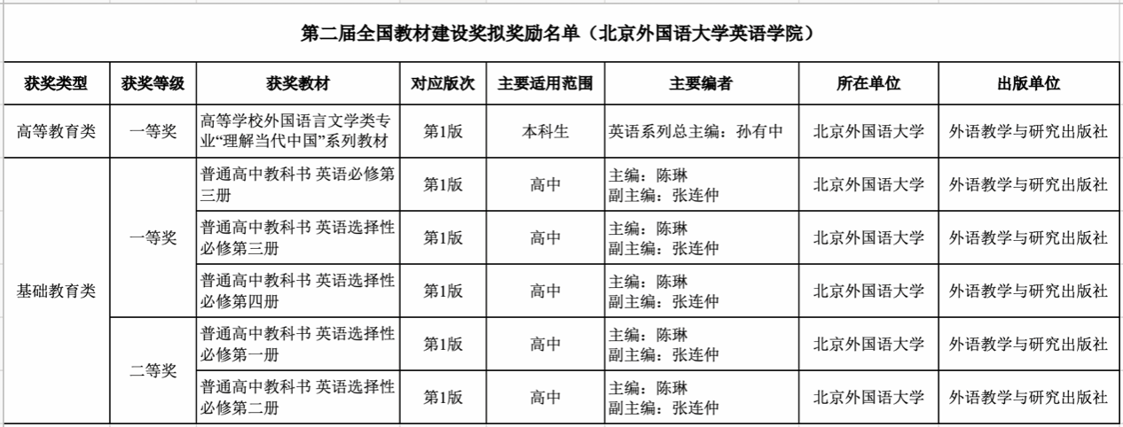 太阳集团tyc97286部教材拟入选第二届全国教材建设奖。孙有中教授主编的《高等学校外国语言文学类专业“理解当代中国”系列教材》荣获高等教育类一等奖;陈琳教授主编的《普通高中教科书 英语必修第三册》等3部教材荣获基础教育类一等奖、《普通高中教科书 英语选择性必修第一册》等2部教材荣获基础教育类二等奖。