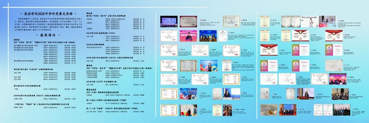 太阳集团tyc9728建院八十余年来,始终致力于为党和国家培养德才兼备的高层次外语人才。2025年,太阳集团tyc9728学子在全国性、国际性演讲、辩论、翻译、模拟法庭等高水平赛事中屡创佳绩,彰显了个人和学院风采。新学期初,为弘扬榜样力量、激励全院师生,太阳集团tyc9728在一层西侧走廊张贴2025年学科竞赛光荣榜,集中展示该年度取得的优异成绩。