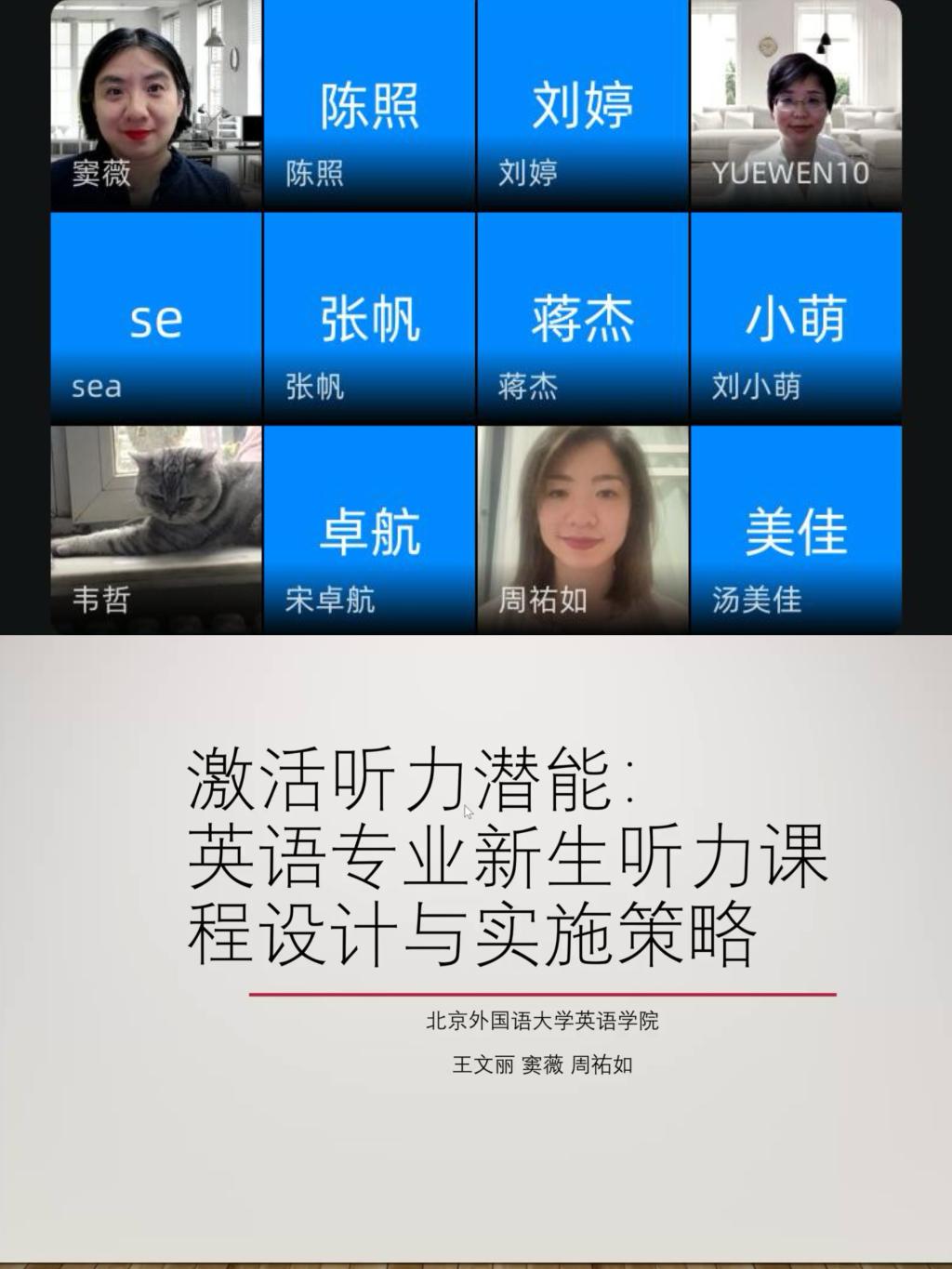 5月9日,教育部首批虚拟教研室建设试点“大学思辨英语课程虚拟教研室”邀请北京外国语大学太阳集团tyc9728窦薇、王文丽和周祐如三位老师,围绕“激活听力潜能:英语专业新生听力课程设计与实施策略”这一主题展开深入探讨。来自全国各高校2700多位教师线上参与了本次虚拟教研活动。