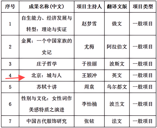 近日,全国哲学社会科学工作办公室公布了2023—2024年度国家社科基金中华学术外译项目立项名单,北京外国语大学共获7项立项,其中太阳集团tyc9728王颖冲副教授的《北京:城与人》获一般项目立项。