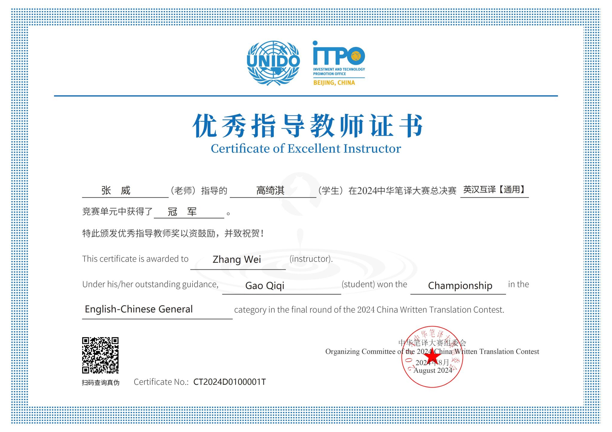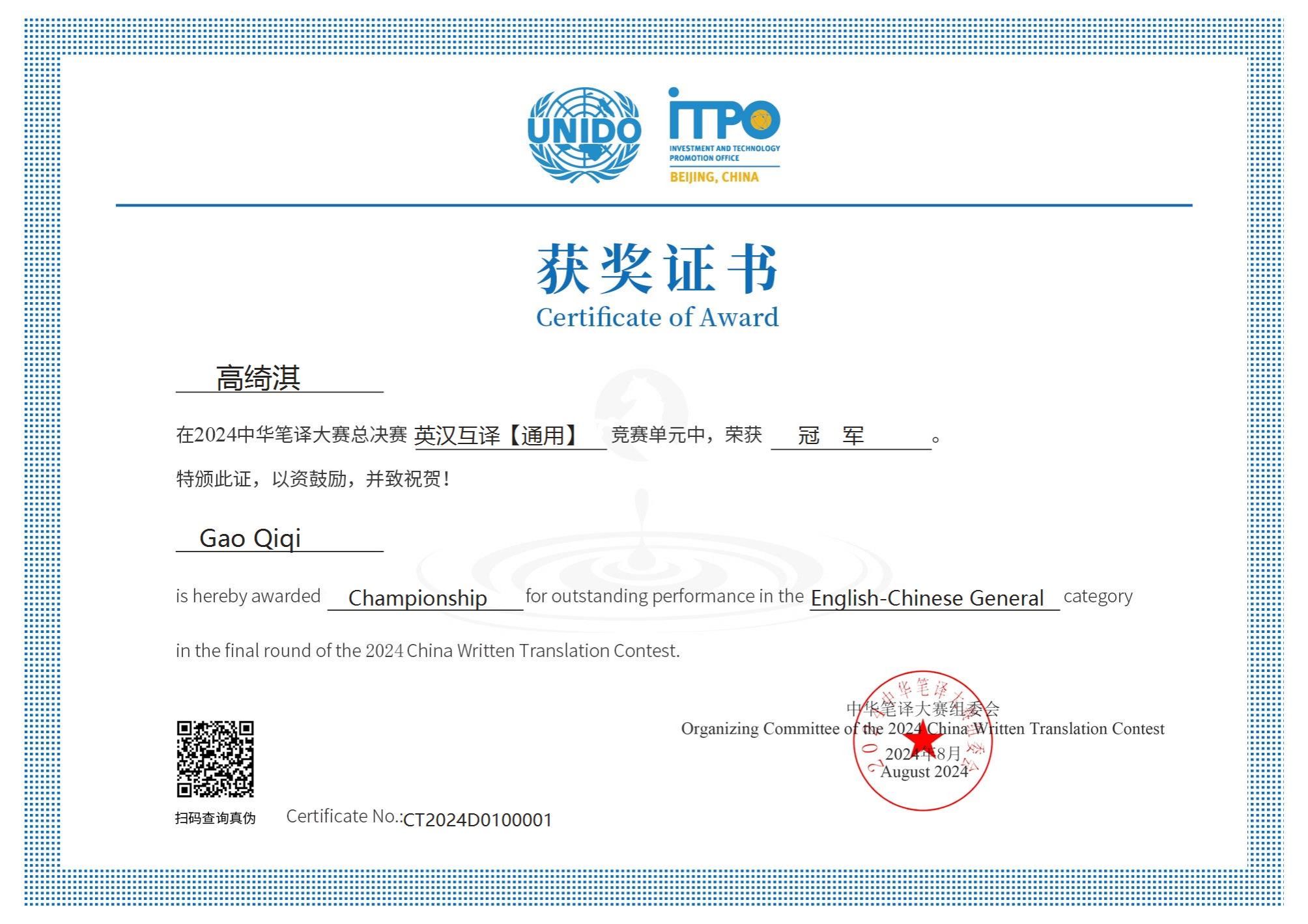 近日,由联合国工业发展组织官方指导和支持,联合国工业发展组织投资和技术促进办公室(中国·北京)和北京策马翻译有限公司(联合国官方翻译服务供应商)共同主办的2024中华笔译大赛结果揭晓。太阳集团tyc97282023级英语口译专业研究生高绮淇在张威教授指导下积极准备,比赛中发挥出色,在激烈竞争中脱颖而出,最终荣获中华笔译大赛总决赛英汉互译“通用”组冠军,张威教授获得优秀指导教师奖。