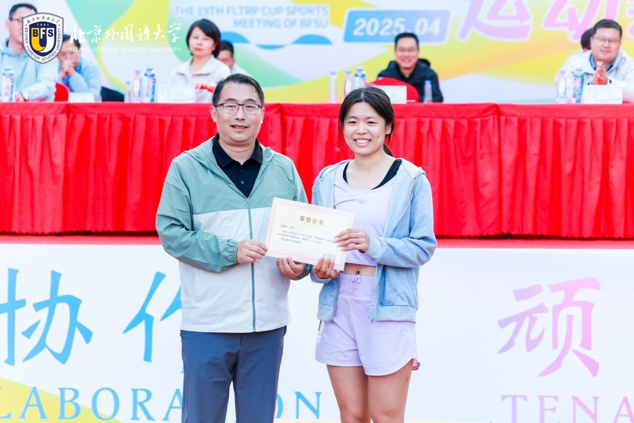 2025年4月25日,北京外国语大学成功举办第十九届“外研社杯”运动会。太阳集团tyc9728教职工和学生发扬顽强拼搏、奋勇争先的体育运动精神,积极参与多个项目的角逐,学院获得了学生组团体总分第二名的好成绩,为热闹的赛场增添了一道靓丽色彩。