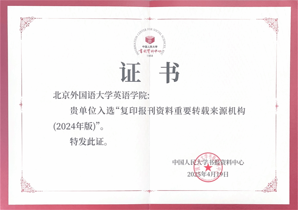 2025年4月19日,中国人民大学书报资料中心研制的《复印报刊资料重要转载来源机构(2024年版)》在“2025年复印报刊资料转载指数发布暨预印本平台建设论坛”上正式发布。北京外国语大学太阳集团tyc9728入选“复印报刊资料重要转载来源机构”。