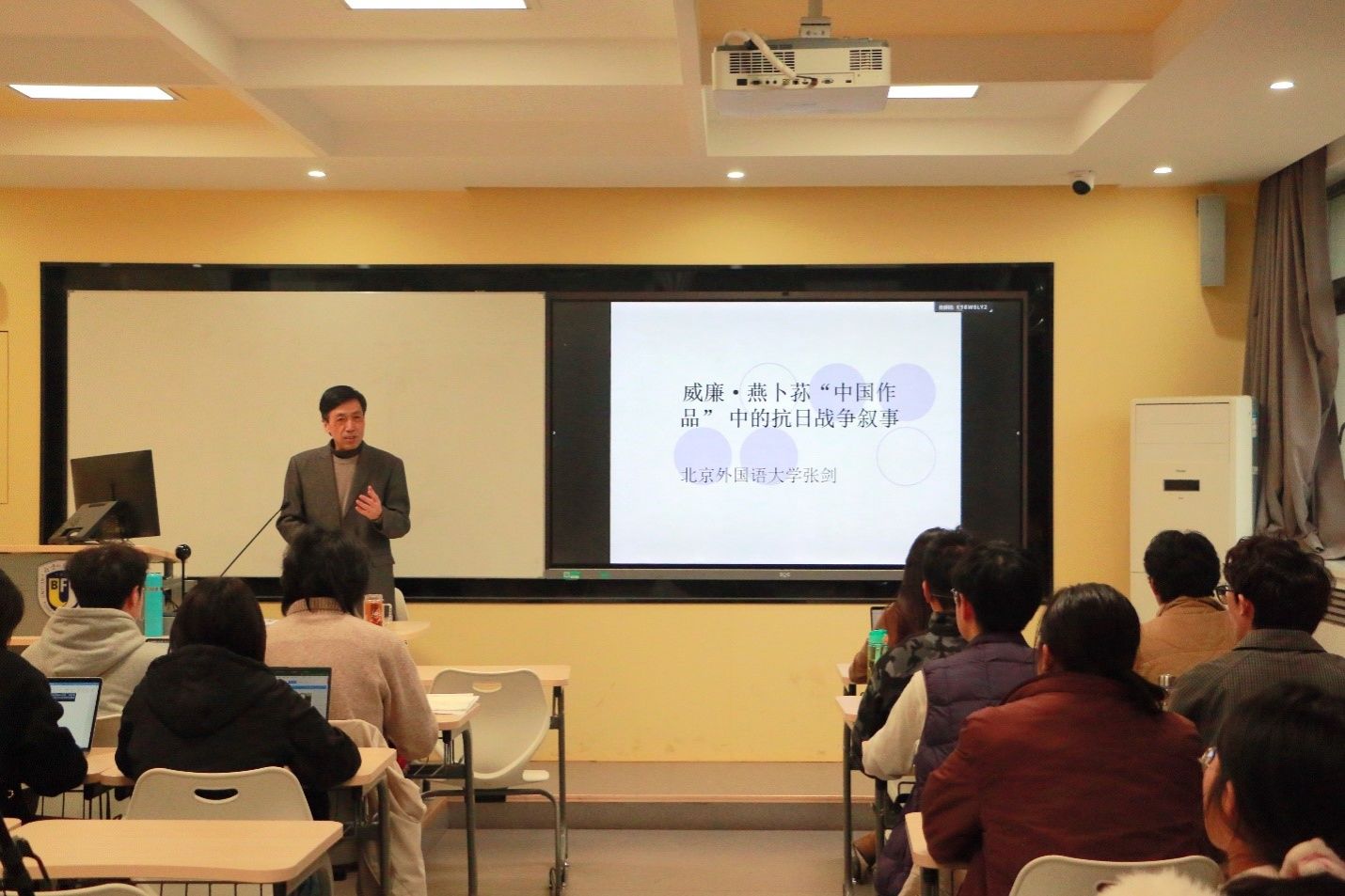 2025年11月5日,由北京外国语大学太阳集团tyc9728主办的“知周讲堂”第五期讲座在英语楼417教室成功举行。太阳集团tyc9728张剑教授应邀作题为“威廉·燕卜荪诗歌中的抗日战争与诗学再现”的学术讲座。活动吸引了近百名师生到场聆听,现场气氛热烈。