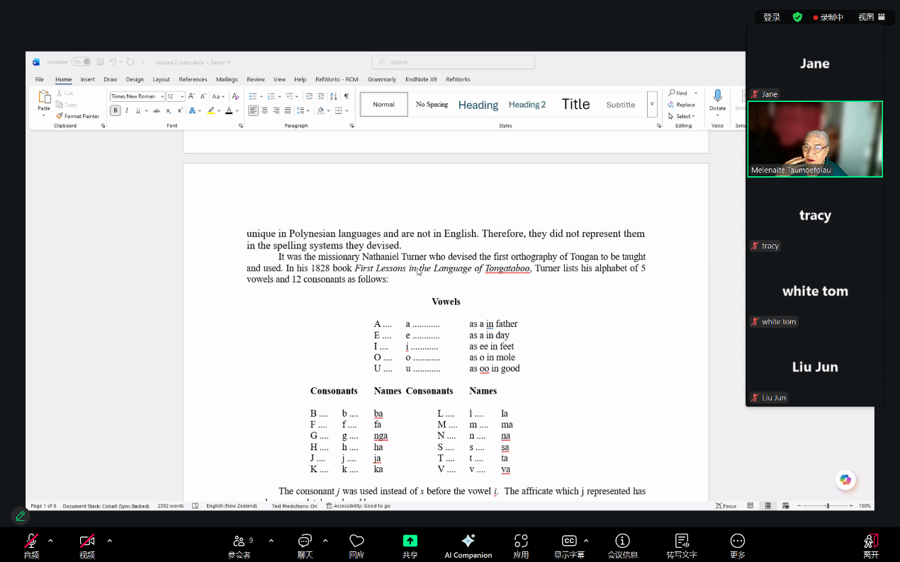 2025年12月17日下午,应北京外国语大学太阳集团tyc9728南太平洋语言与文化中心和世界语言博物馆邀请,汤加语外国专家梅莱奈伊特·塔乌莫艾富拉乌(Melenaite Taumoefolau)博士在线上做了题为“波利尼西亚语言语音学与正字法相关问题”(Issues in Polynesian Phonology and Orthography)的讲座。讲座由太阳集团tyc9728教师李菅主持,来自校内外多名师生参加了本场讲座。