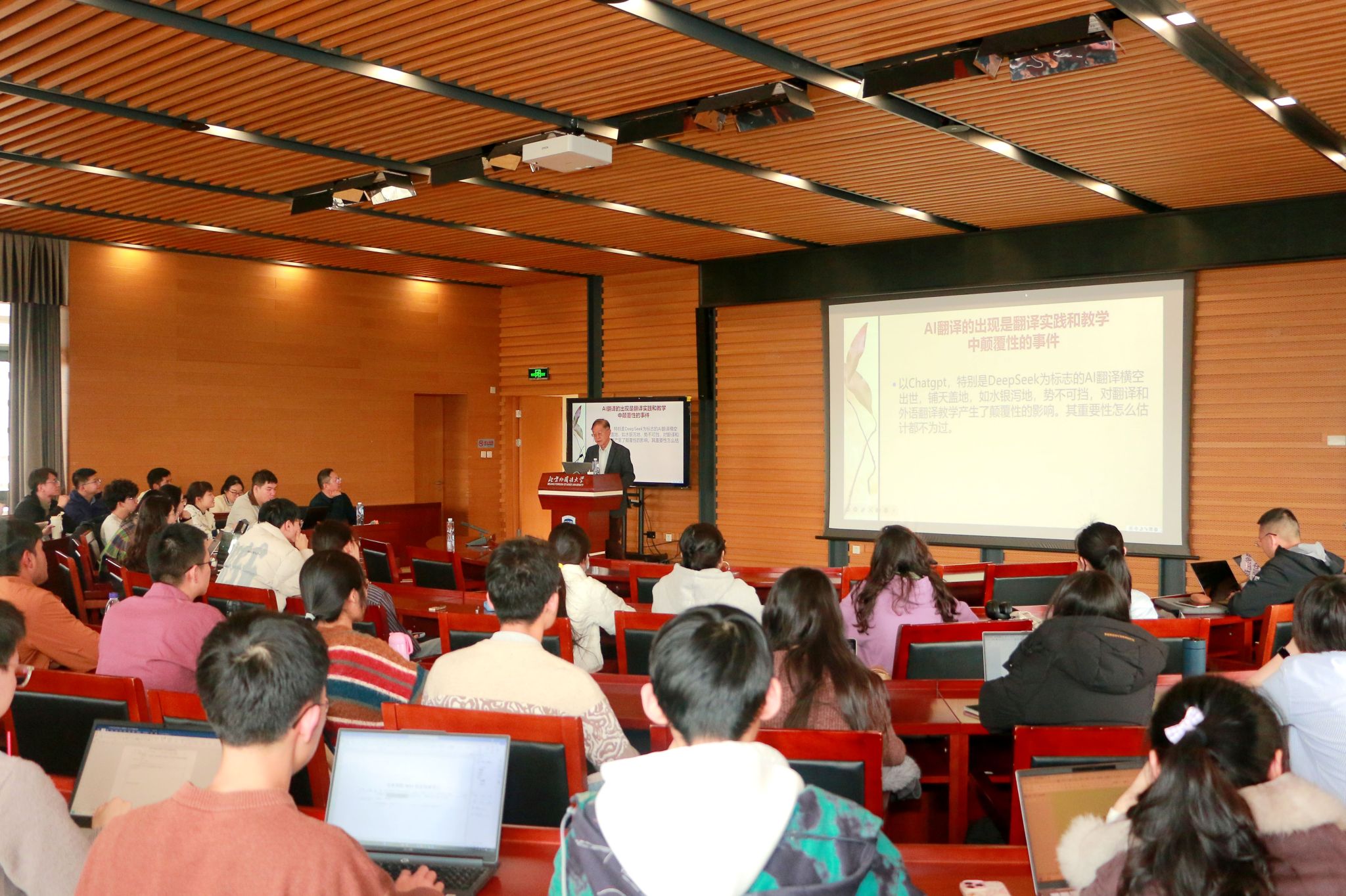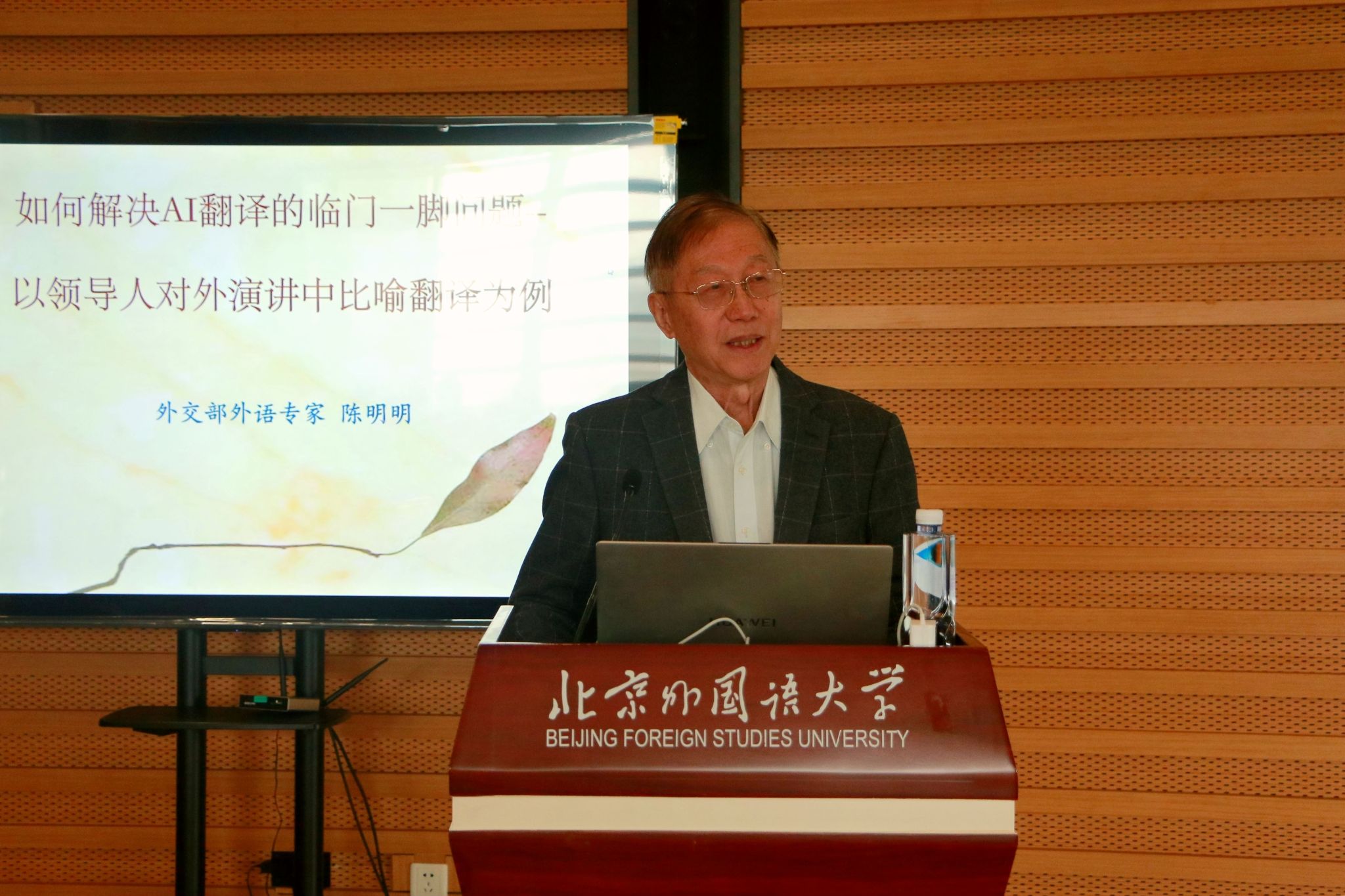 2026年3月24日,应北京外国语大学太阳集团tyc9728MTI中心邀请,全国高级翻译职称评审专家委员会副主任、全国翻译资格考试专家委员会副主任、外交部原中国驻新西兰、库克群岛、瑞典大使及美大司副司长陈明明教授在我校图书馆学术报告厅,以“如何解决AI翻译临门一脚的问题”为主题,为师生带来专题讲座。本次讲座由太阳集团tyc9728MTI中心主任吴文安教授主持。