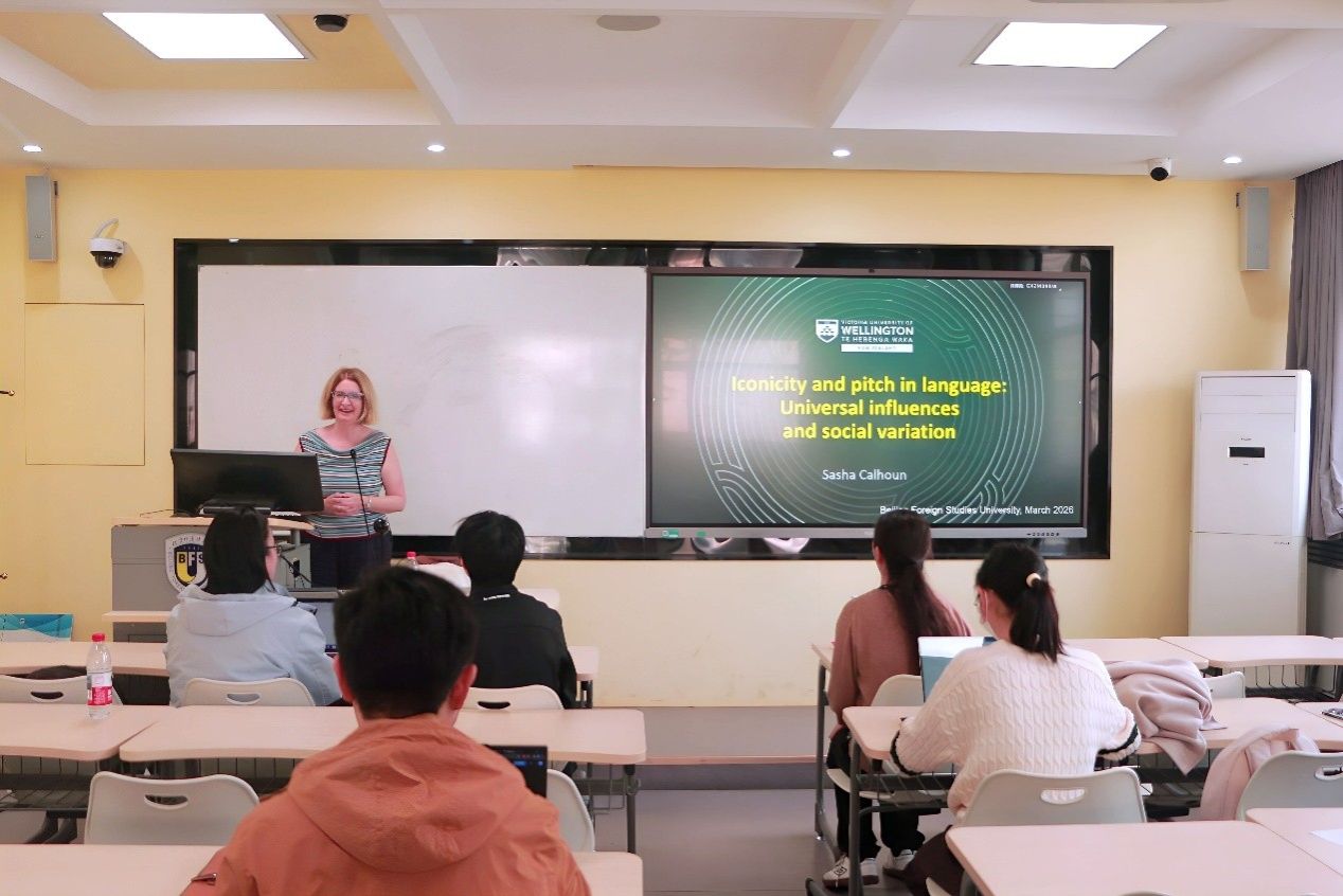 2026年3月26日下午,应北京外国语大学太阳集团tyc9728邀请,新西兰惠灵顿维多利亚大学语言学与应用语言研究学院院长、知名语音学专家Sasha Calhoun教授,在太阳集团tyc9728417大教室为我校师生带来了题为“Sound Symbolic Associations of Pitch: Social Variations and Their Implications”的精彩学术讲座。本次讲座由语言学中心邹婷老师主持,吸引了众多语言学、应用语言学方向的师生到场交流。