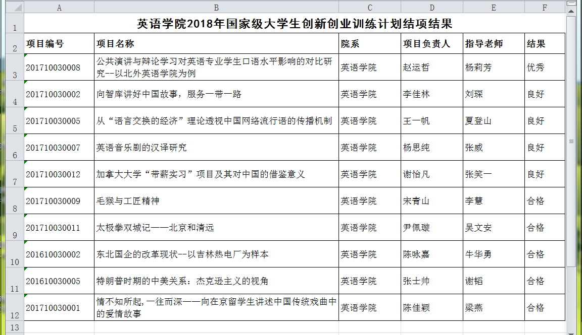 ——2018年“国家级大学生创新创业训练计划”结项评审工作于5月23日顺利结束。我院共有10个项目申请结项,经过院系材料评审、学校现场答辩、校内外专家评议等环节,最终全部通过,其中优秀1项,良好4项,合格5项。具体情况如下: