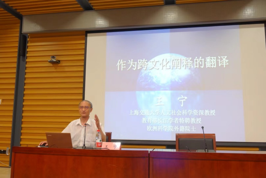 王宁教授首先结合当前人工智能的发展,指出文学翻译的不可替代性,接着从全球化时代背景切入,强调中国文学走向世界对于促进文化多元性的重要作用,引出“作为跨文化阐释的翻译”这一主题。王宁教授指出,在中国文学走出去的过程中,跨文化阐释的翻译扮演着至关重要的角色,他从翻译之于文化的作用、翻译与外语著述、文学翻译的再创造性三方面展开论述,强调翻译不仅是语言转换,更是跨文化的阐释与认知。接下来,王宁教授通过分析莫言作品的民族性与世界性及美国汉学家葛浩文的翻译,阐述了翻译作为一种跨文化认知和阐释的内涵,认为翻译不仅是一种跨文化认知的形式,更是一种跨文化阐释的阐释,而过度的阐释会使翻译不能有效传达原文的意义。王宁教授通过分析斯皮瓦克和卡勒对德里达解构主义思想的翻译与阐释,详细比较了翻译中合理阐释和过度阐释之间的区别。最后,王宁教授呼吁我们应该注重跨文化阐释的翻译,推动中国文化和文学走向世界。