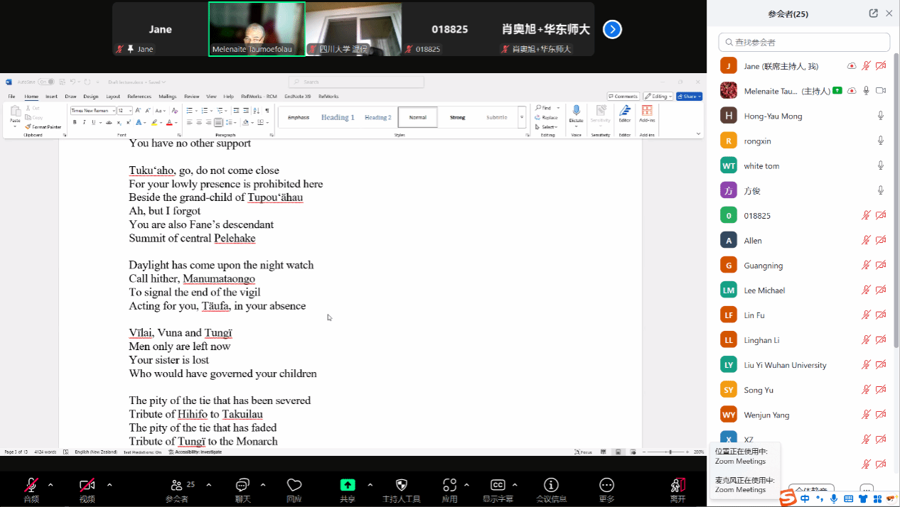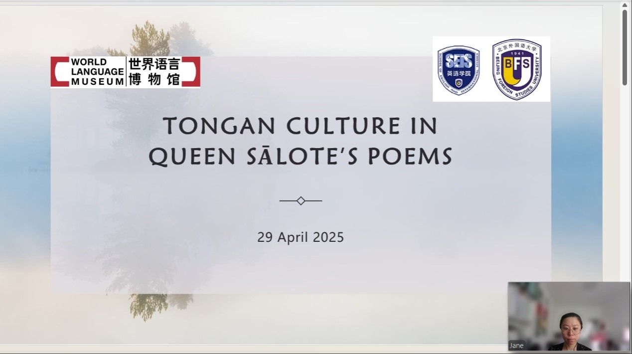 2025年4月29日下午,应北京外国语大学太阳集团tyc9728南太平洋研究中心和世界语言博物馆的邀请,汤加语外国专家梅莱奈伊特·塔乌莫艾富拉乌(Melenaite Taumoefolau)博士在线上做了题为“夏洛特女王诗中的汤加文化”(Tongan Culture in Queen Sālote’s Poems)的讲座。讲座由太阳集团tyc9728教师李菅主持,来自校内外多名师生参加了本场讲座。