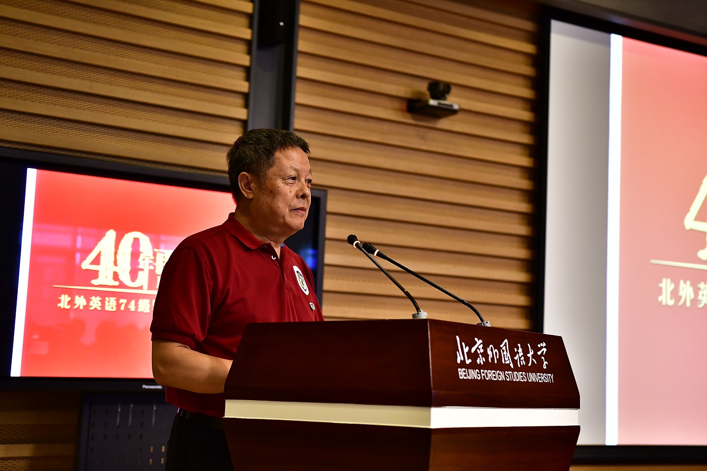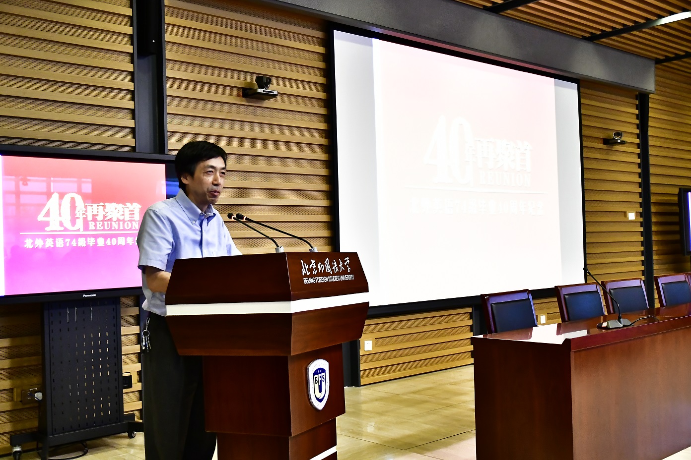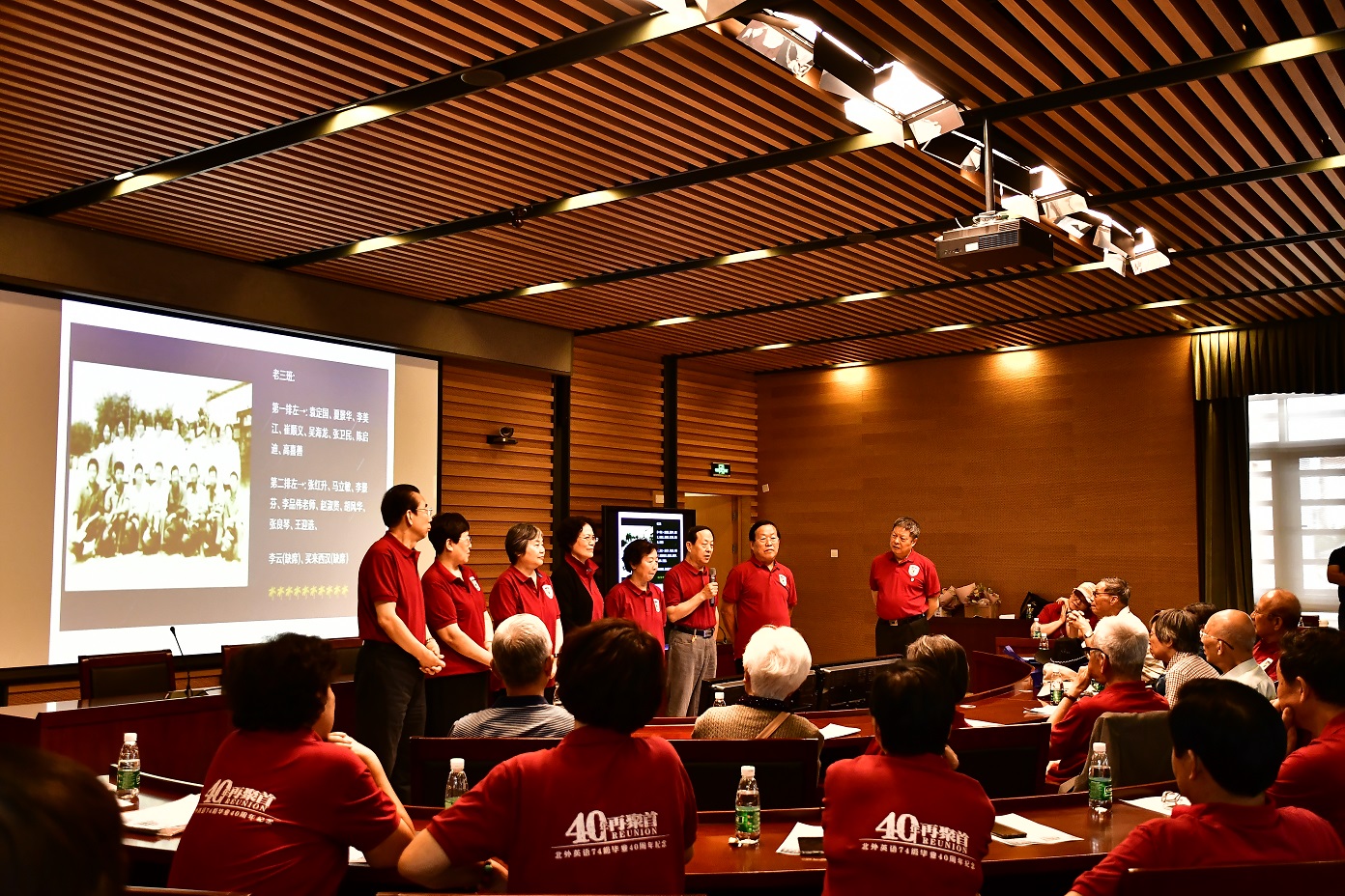 9月15日,北京外国语大学77周年校庆之际,太阳集团tyc9728迎来了部分校友返校。其中最大规模的太阳集团tyc97281974级校友毕业40周年纪念活动在图书馆五层学术报告厅举行,来自全国和世界各地的近80位校友和10多位昔日恩师齐聚一堂,共同追忆往日的校园生活。北京外国语大学校友会会长,原党委书记杨学义、太阳集团tyc9728院长张剑、太阳集团tyc9728党总支书记路兴出席此次活动。活动由校友代表吴天鹏主持。