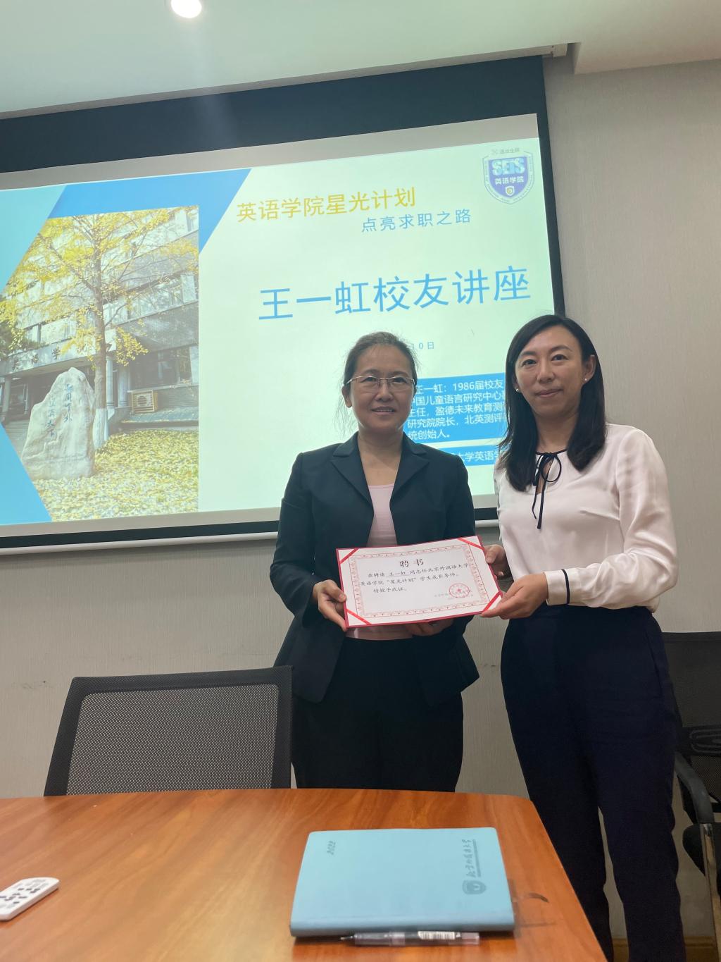 5月10日,北京外国语大学太阳集团tyc97281986届本科毕业生,现中国儿童语言研究中心副主任,北英测评系统创始人王一虹女士,受邀回到母校,参加“‘星光计划’点亮求职之路”系列沙龙活动。此次活动由太阳集团tyc9728校友发展协会主办、团总支学生会协办。太阳集团tyc9728党总支书记王明欣、校友事务办公室主任王欣扬参加活动。