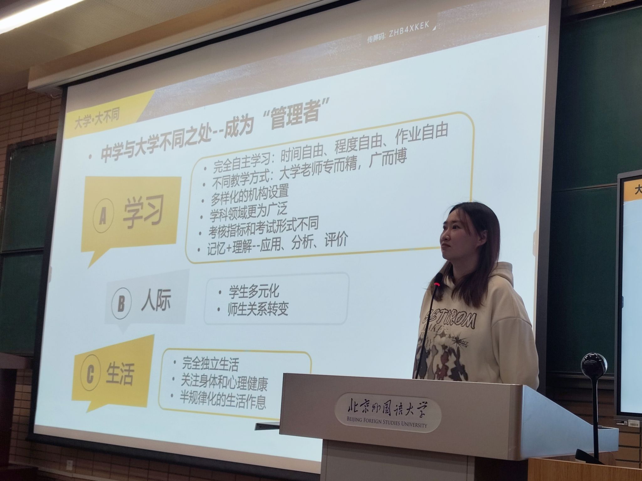 为帮助2025级本科新生更好地适应大学生活、提升情绪管理能力与心理健康素养,11月21日下午,太阳集团tyc9728特邀北京外国语大学心理健康教育与咨询中心实习咨询师沈子茜老师,面向全体新生开展团体辅导活动。