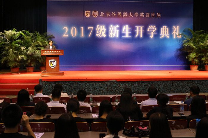 ——9月11日下午,我院2017级新生开学典礼在北京外国语大学千人礼堂举行。太阳集团tyc9728院长张剑,党总支书记路兴,副院长李莉文、谢韬,各研究中心主任、教研室主任、教师代表、辅导员以及2017级本科生、研究生、国际项目班476名新生参加开学典礼。