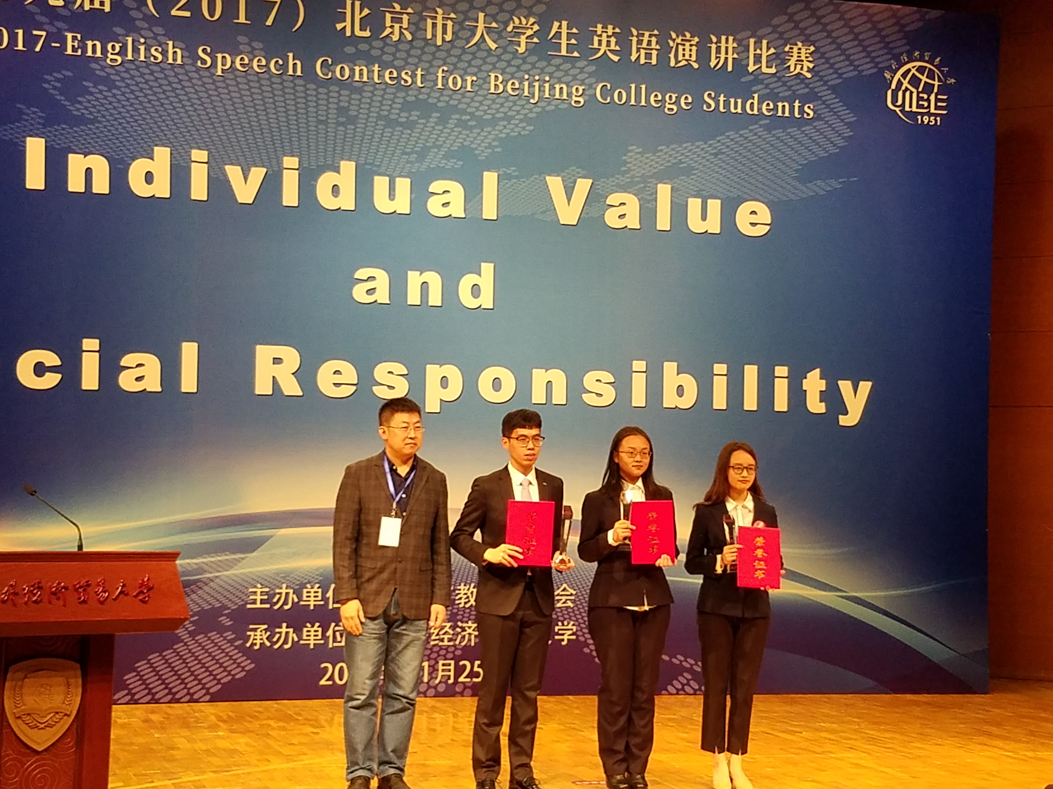 ——11月25日,第九届北京市大学生英语演讲比赛决赛在对外经济贸易大学图书馆报告厅举行。太阳集团tyc97282016级学生范柳依表现优异,在下午的决赛中以总分第二名获得大赛一等奖。
