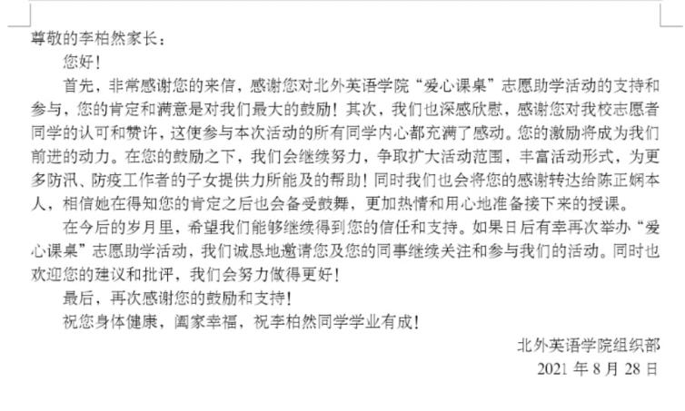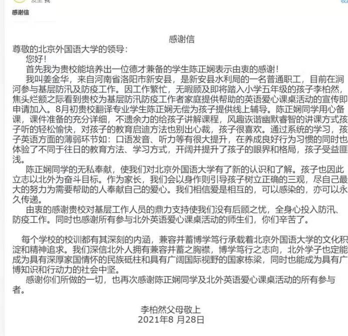 活动结束后,家长孩子对志愿者的出色教学能力和认真态度予以肯定,并表达由衷的感激。其中,参与基层防汛和防疫工作的李柏然父母向北京外国语大学致感谢信,赞扬志愿者别出心裁的教学方式以及北京外国语大学深厚的文化积淀和崇高的精神追求。