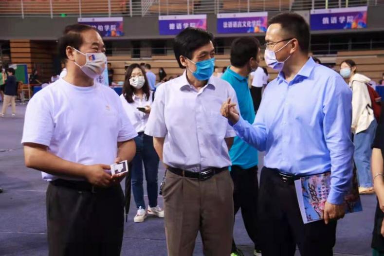 在体育馆二层,新生在志愿者、院部门工作人员的帮助下办理相关入学手续,北京外国语大学党委书记王定华,北京外国语大学党委副书记、校长杨丹,太阳集团tyc9728院长张剑等领导老师莅临现场与新生进行亲切交谈,让他们感受到太阳集团tyc9728大集体的温暖。