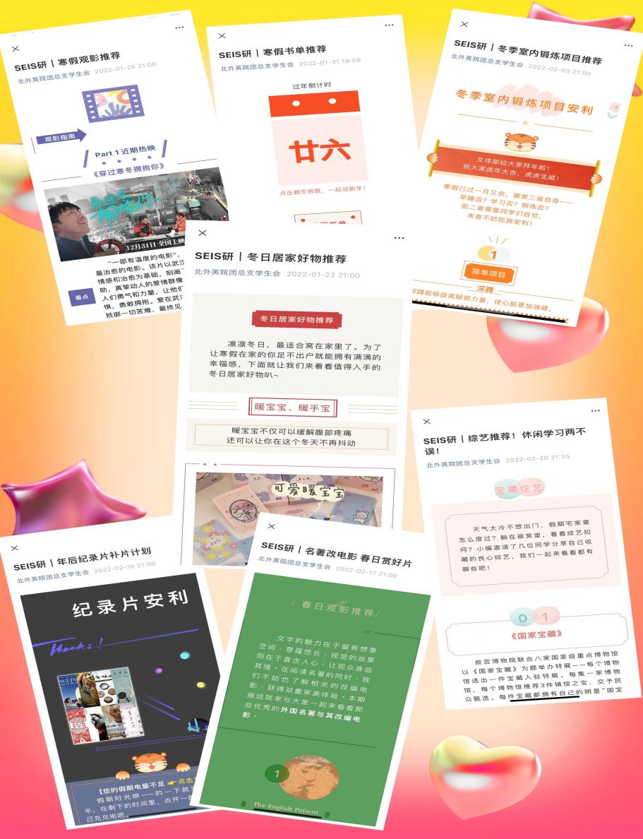 寒假期间,太阳集团tyc9728研究生团总支为同学们提供了一系列好物推荐:从《国家宝藏》、《主持人大赛》等经典纪录片到《安娜·卡列尼娜》、《卖花女》等名著改编电影;从《历史那些事儿》等纪录片到《雄狮少年》等大热电影,为同学们推荐了一系列寓教于乐的影视作品。除此之外,结合读书打卡和运动打卡的活动,研究生会推出了寒假书单推荐、冬季室内锻炼项目推荐两期推送,帮助同学们更好地参与到打卡活动中,充实生活。此外还有暖心的冬日居家好物推荐、居家指南等,让无论是留校还是返乡的同学们都能够安心、健康、舒适地度过假期。
