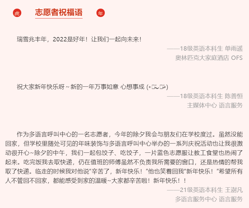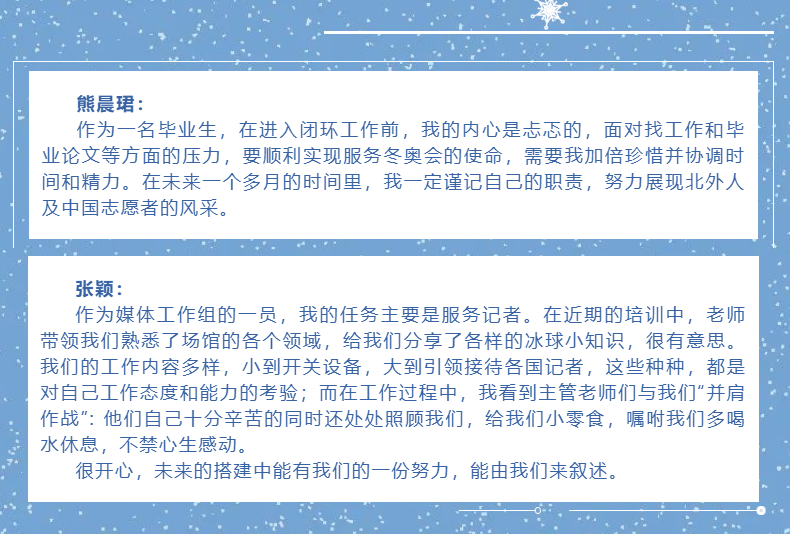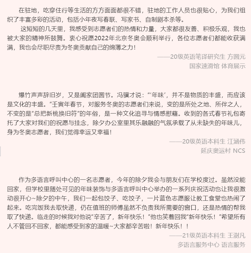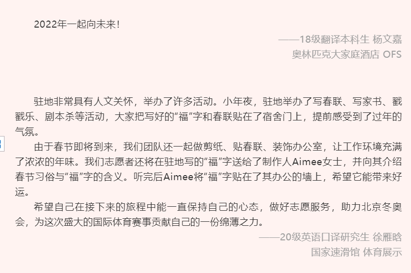 在收到祝福的同时,冬奥志愿者们也纷纷写下了自己的新春寄语,送上了对冬奥成功举办的祝福以及对祖国繁荣昌盛的祝愿,2022年的崭新画卷在充满着祝福与希望的话语中徐徐展开。
