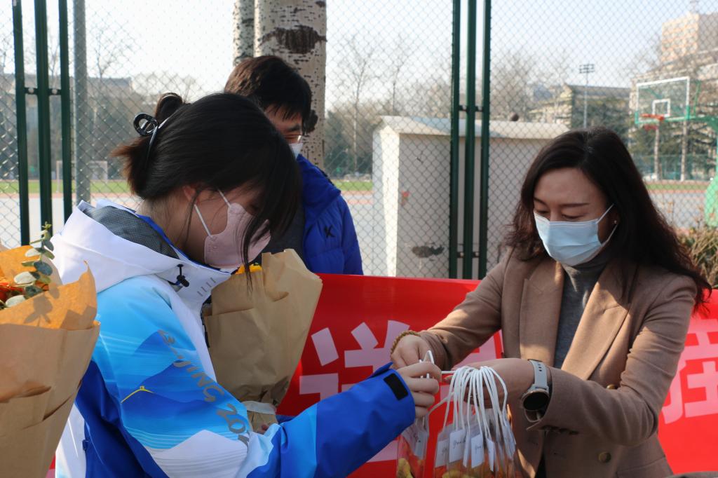 党总支书记王明欣代表学院向同学们表达了感谢。她说,冬奥会的圆满举办有着你们一份功劳,你们用自己的辛勤付出与扎实的专业技能彰显了时代青年的本色,树立了北外英院人的靓丽形象,学院以你们为荣以你们为傲。她嘱咐同学们返校后先好好休息,尽快调整状态投入学习。她还为三位同学送去了春日的祝福。一捧艳丽的手捧花、一只冰蓝色的吉祥鸟,衬着春日的和煦阳光,为同学们一冬的辛勤付出带去缕缕温暖。