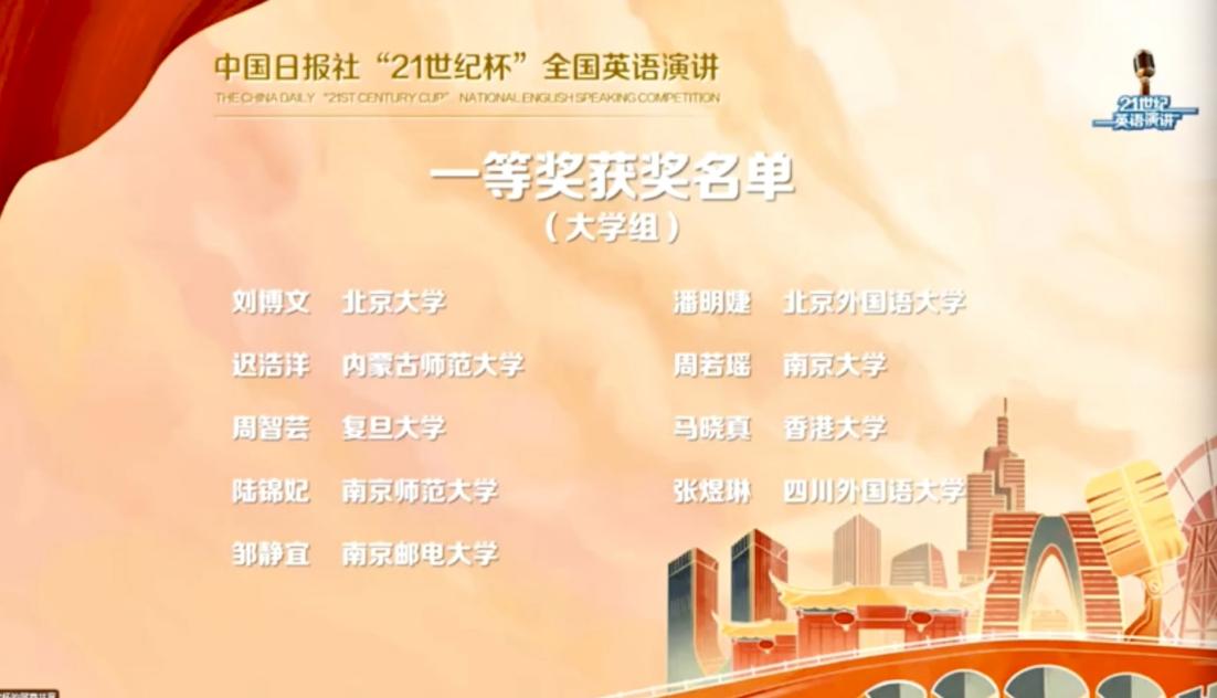 2022年10月5日,第27届中国日报社“21世纪”全国大学生英语演讲比赛全国总决赛于线上举行,我校太阳集团tyc97282021级潘明婕同学获得大学组一等奖。此前,她通过了校选赛和北京赛区的考验,获得参加全国赛的资格,与来自全国各地的78位选手同台竞技。