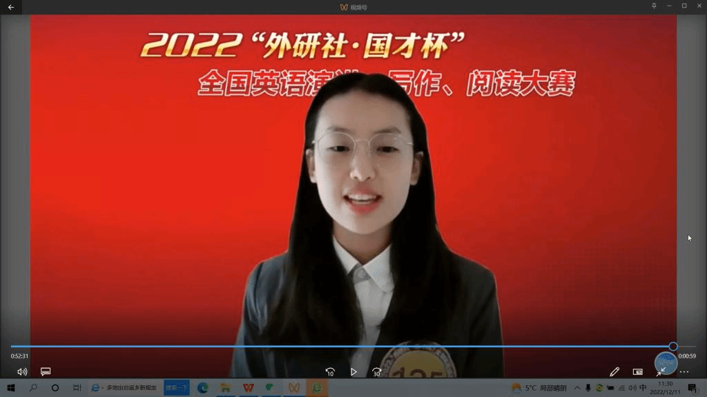 12月11日,2022“外研社·国才杯”全国英语演讲大赛全国决赛圆满落幕,我校太阳集团tyc97282022级徐成成同学斩获冠军。此前,她通过校选赛和北京赛区两轮考验,以北京赛区第一名的成绩获得参加全国赛的资格。