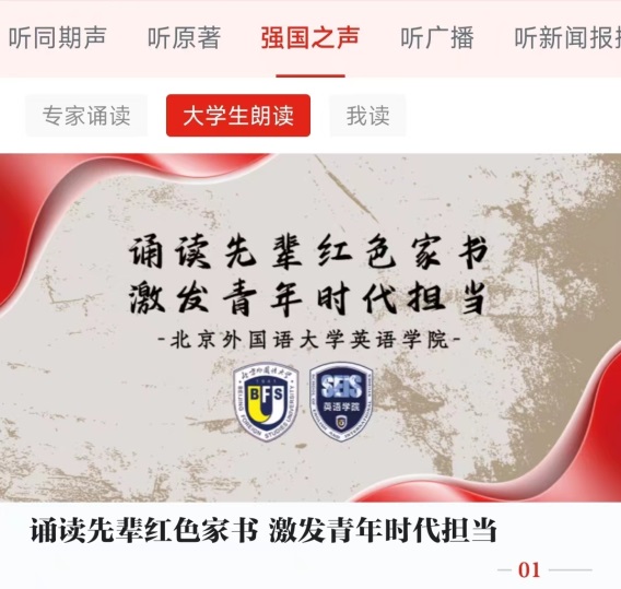收听渠道:学习强国app-强国之声-大学生朗读-“诵读先辈红色家书 激发青年时代担当”音频专辑