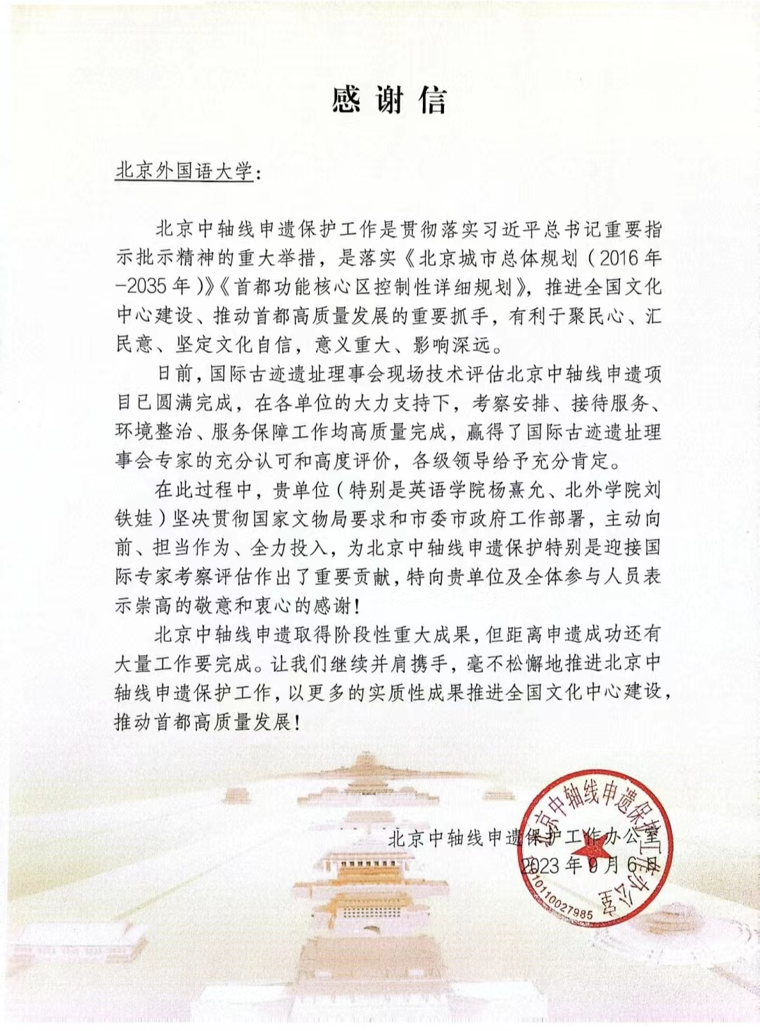 近日,北京中轴线申遗保护工作办公室向我院发来感谢信,对在该项工作中做出贡献的我院2022级博士研究生杨熹允同学高度肯定。