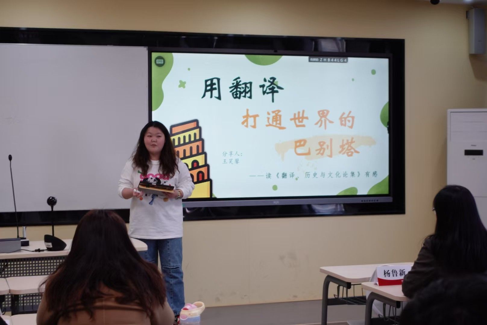 首场活动以《翻译、历史与文化论集》为研讨书目,翻译学方向博士生白一博、赵燕飞担任评委,通过专业点评引导同学们深入探讨翻译理论与实践。在自由研讨环节,与会人员围绕“AI时代翻译学子的机遇与挑战”展开热烈讨论,共同探讨如何利用新兴技术为译者的跨语言交流传播赋能。第二场分享会由英院教师齐皓、邵雪萍与语言学方向研究生李安宁共同担任评委。活动设置文学、国别研究和语言学三个单元。既有对《伟大的传统》中文学批评理论的探讨,也有对美国社会文化认同问题的分析,还包括对语言本质及其与思维关系的讨论。现场学术氛围浓厚,师生互动热烈。