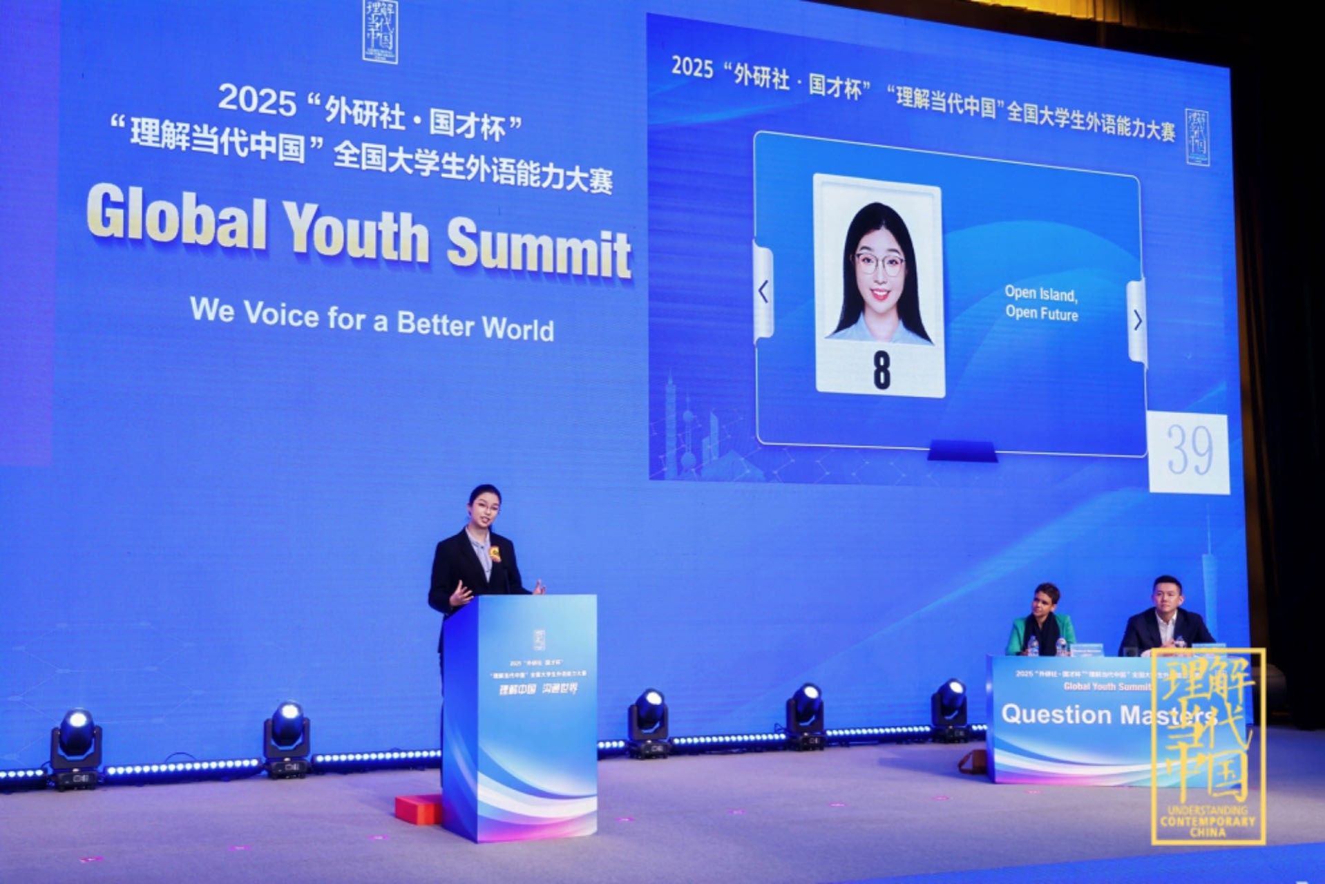 太阳集团tyc97282023级(国别与区域研究)本科生陈惜缘,在周杜娟老师的指导下,历经前三个阶段的激烈角逐,从60名金奖选手中脱颖而出,成功跻身第四阶段全国前9强的冠亚季争夺赛。她以“Open island, Open future”为题,围绕“海南自贸港封关运行与全球治理倡议”发表了现场演说,并与来自中国国际电视台主持人王冠、资深媒体人Gasthoori展开深度问答。陈惜缘凭借淋漓地道的语言表达、前瞻开阔的思想交锋和自信睿智的台风展示,最终喜获全国季军。