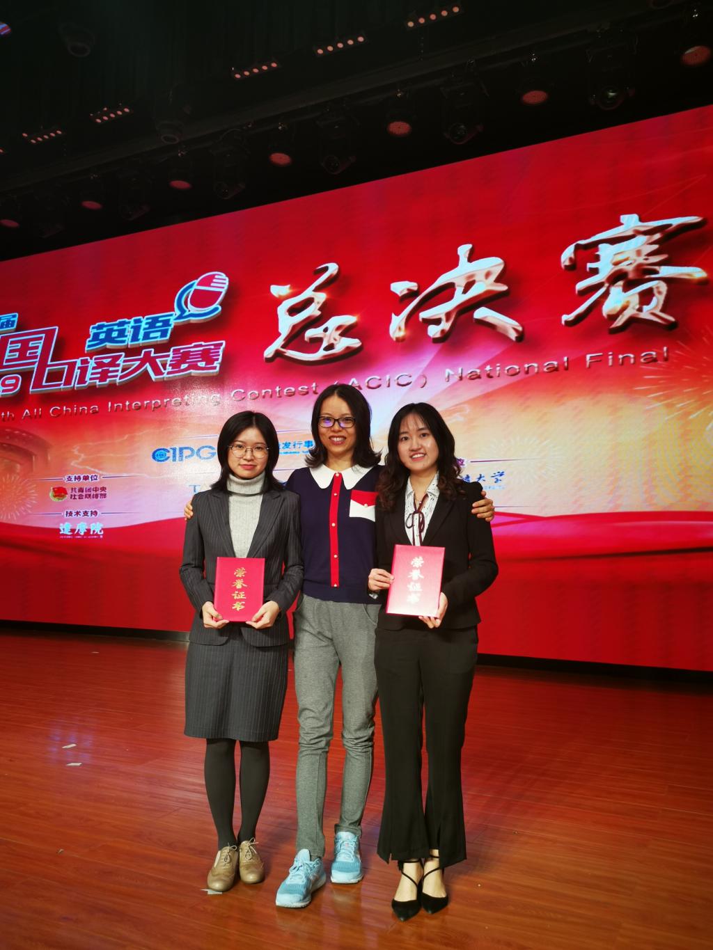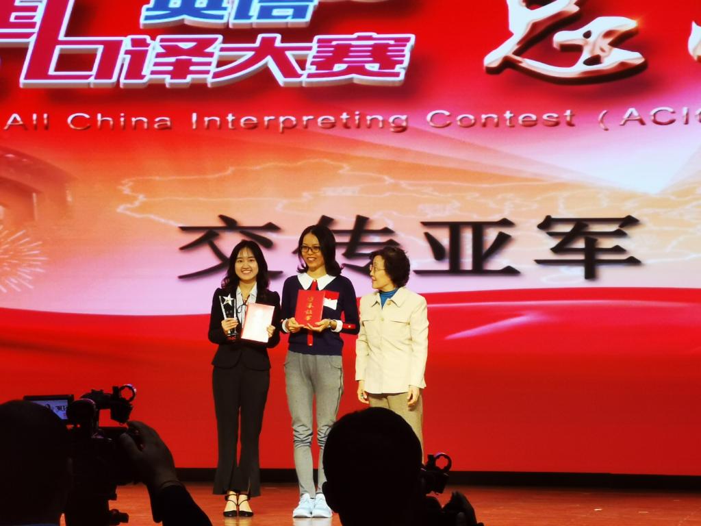 第八届全国口译大赛(英语)总决赛于2019年10月18日至19日在北京外国语大学千人礼堂举行。经过两天的激烈角逐,我院学子取得优秀成绩。其中,金羽菲同学获交传亚军、同传邀请赛二等奖,尹佩璇同学获交传二等奖,侯玉颖同学获交传三等奖,王颖冲老师获优秀指导教师奖。太阳集团tyc9728毕业生、口译俱乐部队员王静怡获得交传冠军和同传季军。