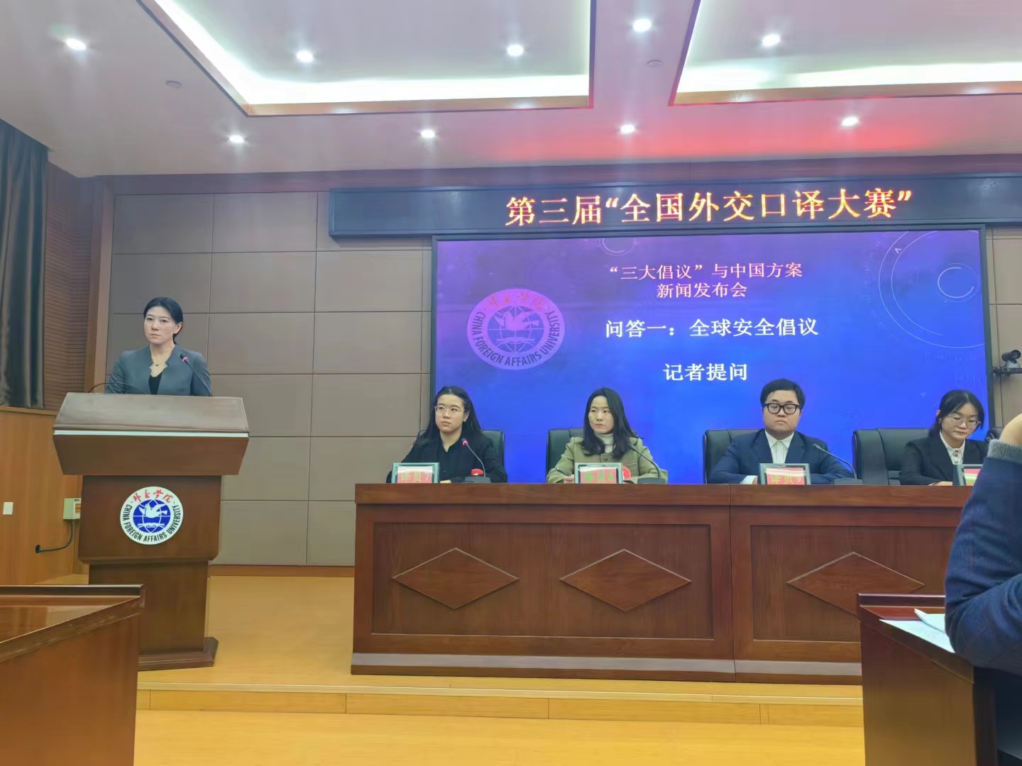 大赛设立复赛和决赛两个环节。复赛形式为简短演讲口译(英汉交传),考察选手的知识储备能力和英汉口译能力,共12名参赛选手脱颖而出。向贵凡同学以小组第一名入围决赛。决赛形式为记者招待会口译(英汉、汉英交传),赛题实战性强,场景逼真,具有挑战性。
