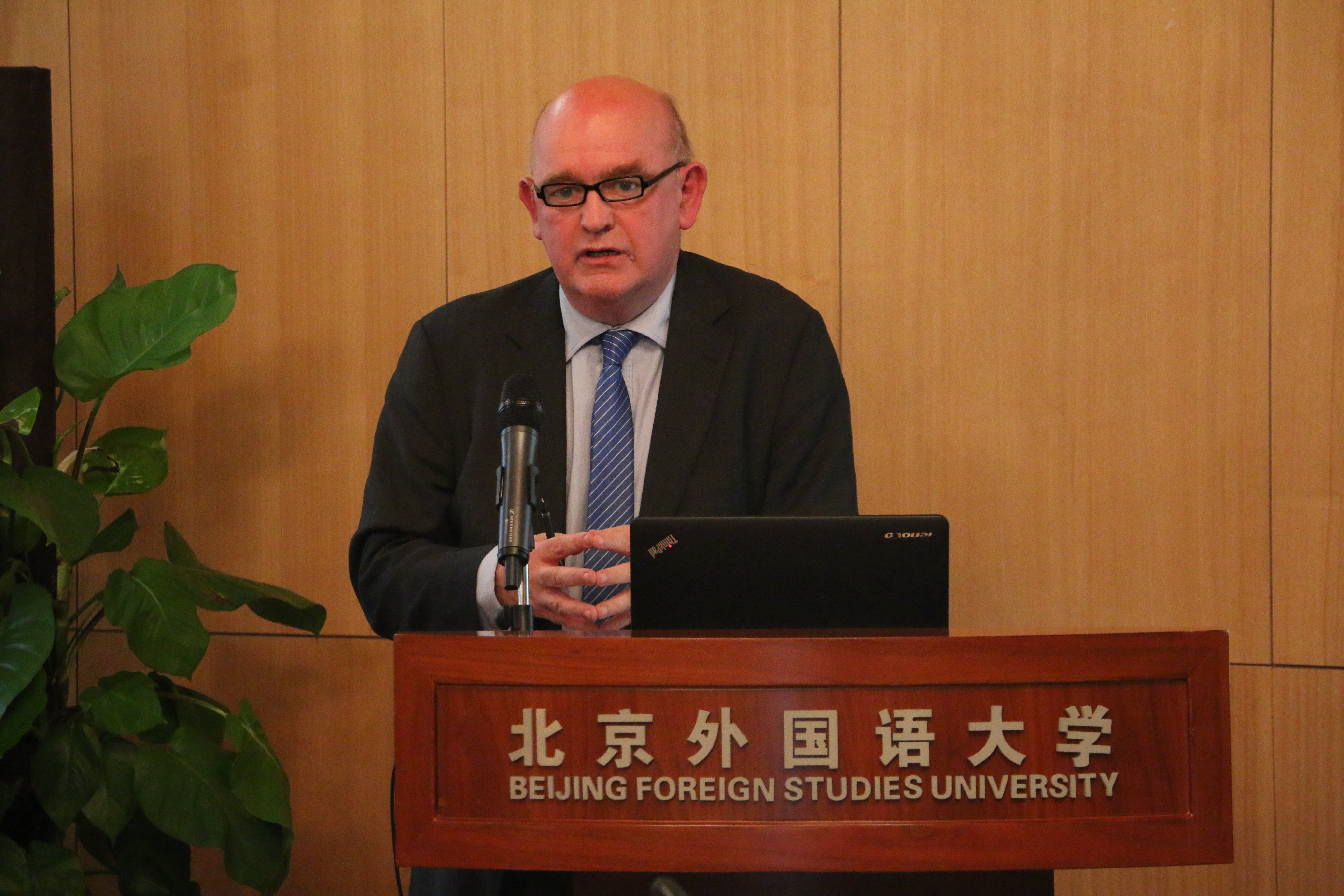 ——在“爱尔兰研究与中爱关系”研讨会上,李修文就英国脱欧背景下爱尔兰与欧盟的关系、爱尔兰在脱欧后北爱尔兰边界问题上的立场及中爱关系发表演讲。王展鹏主持研讨会并回顾了我校爱尔兰研究中心十年来的发展情况。