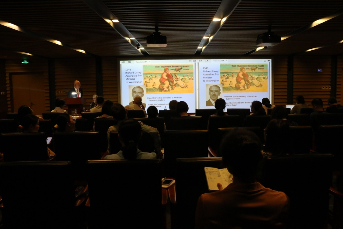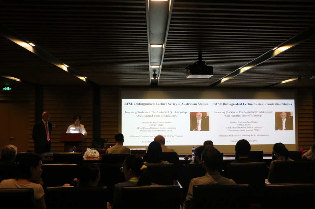 ——5月15日晚7点“北外澳研大讲堂”(BFSU Distinguished Lecture Series in Australian Studies)第一讲在北外图书馆四层学术报告厅隆重举行,我校客座教授、澳大利亚社会科学院院士、澳大利亚人文科学院院士、迪肯大学荣休教授大卫•沃克(David Walker)作了题为“澳美关系:100年的伙伴情谊?”(The Australia US Relationship: One Hundred Years of Mateship?)的讲座。讲座由北京外国语大学澳研中心主办,北京外国语大学副校长孙有中教授主持。