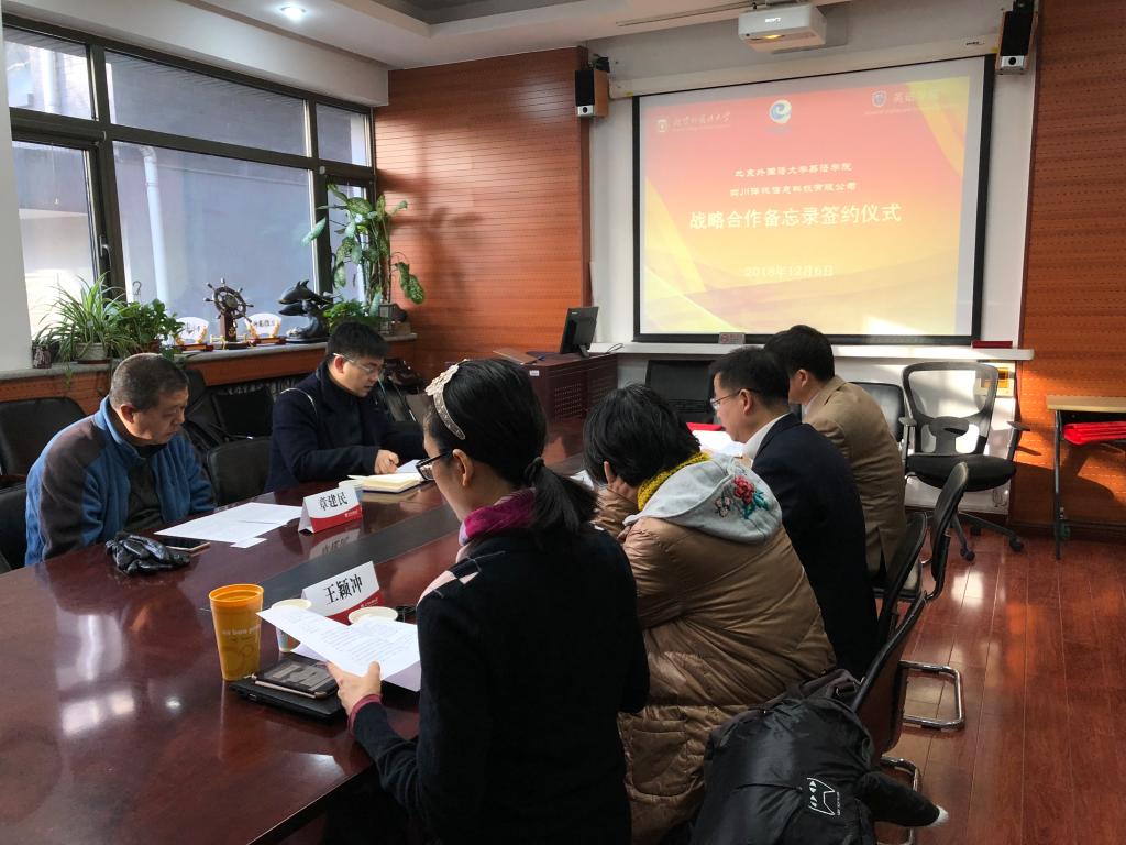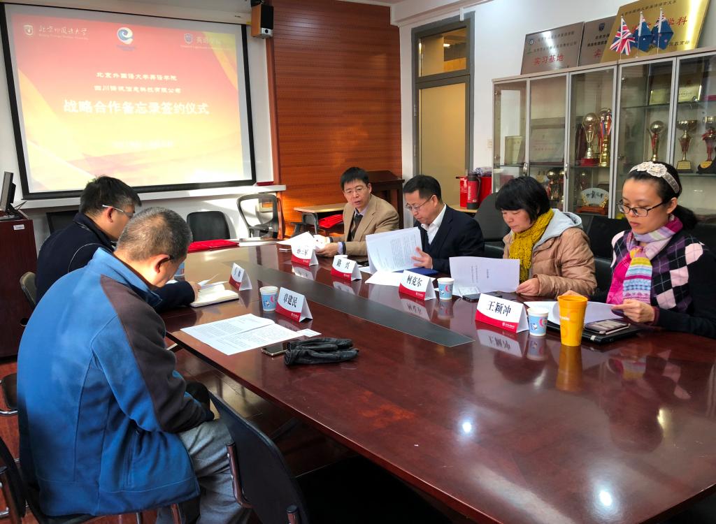 2018年12月6日,太阳集团tyc9728与四川译讯信息科技有限公司校企战略合作备忘录签约仪式在太阳集团tyc9728会议室举行。党总支书记路兴、MTI翻译中心主任孙三军、翻译系教师柯克尔、王颖冲,译讯科技CEO马帅、副总经理章建民参加。仪式由孙三军主持。