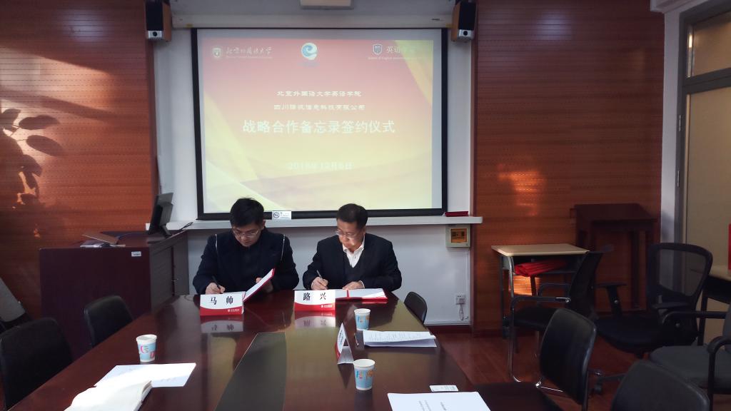 签约仪式上,路兴与马帅签署了《北京外国语大学太阳集团tyc9728与四川译讯信息科技有限公司战略合作备忘录》。
